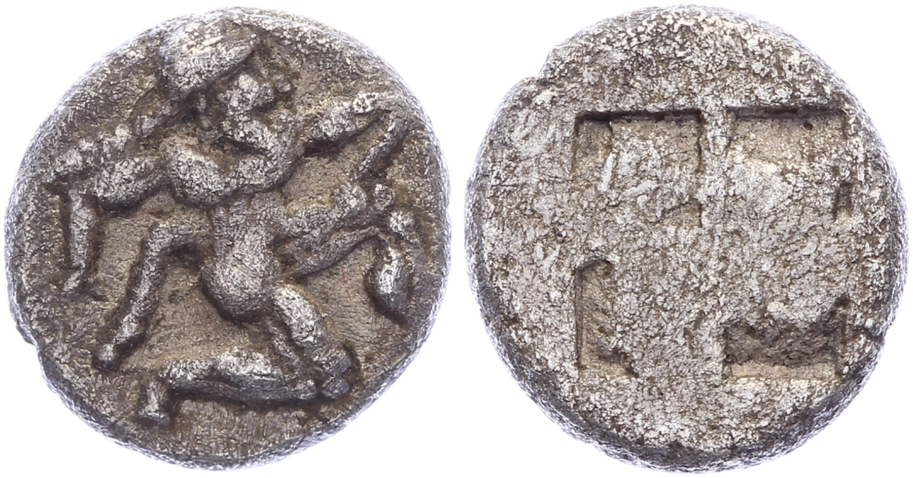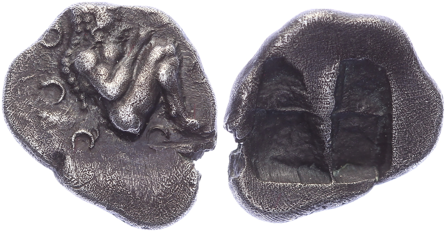 Lot (2) Siris AR Trihemiobol or 1/8 Stater [0,97 + 1,14 gm]. Circa 500-490 BC. Satyr crouching right between six circles / Diagonally divided quadripartite incuse square. Cf. SNG ANS 971-973. Surfaces a bit granular, toned gVF (plus Thasos, AR Trihemiobol SNG Copenhagen 192, BMC 29).Purchased from F. Javorṡek, June 1997