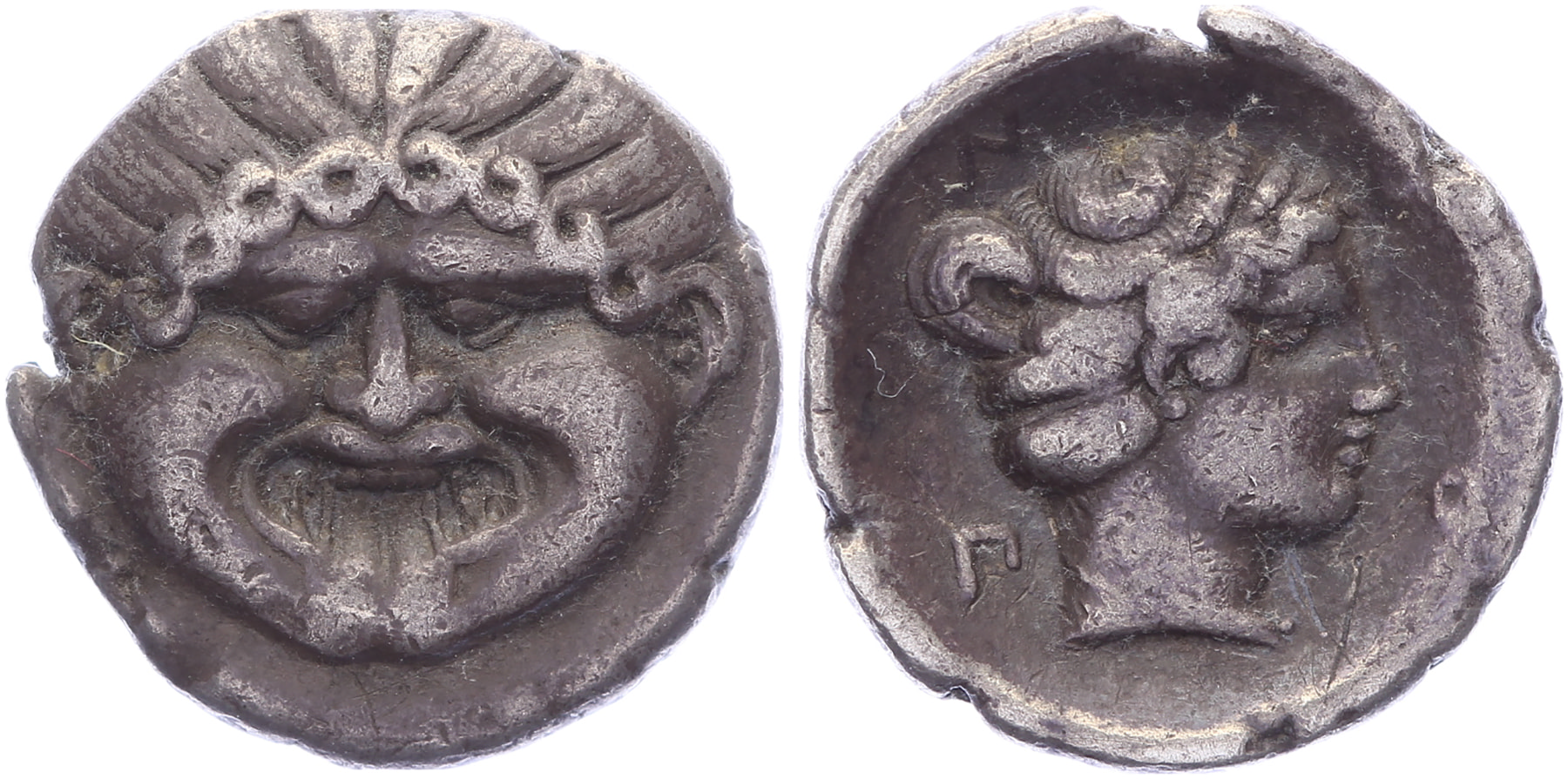 Circa 400-360 BC. AR Hemidrachm [1,86 gm, 14,3 mm]. Head of a gorgon facing, tongue outstretched / N - E - O - Π, laureate head of the Parthenos to right, wearing a simple necklace with a pendant and with her rolled up into a bun at the back. SNG ANS 433, 441; SNG Oxford 2329. Toned nice VF. Purchased from Holleman, September 1982