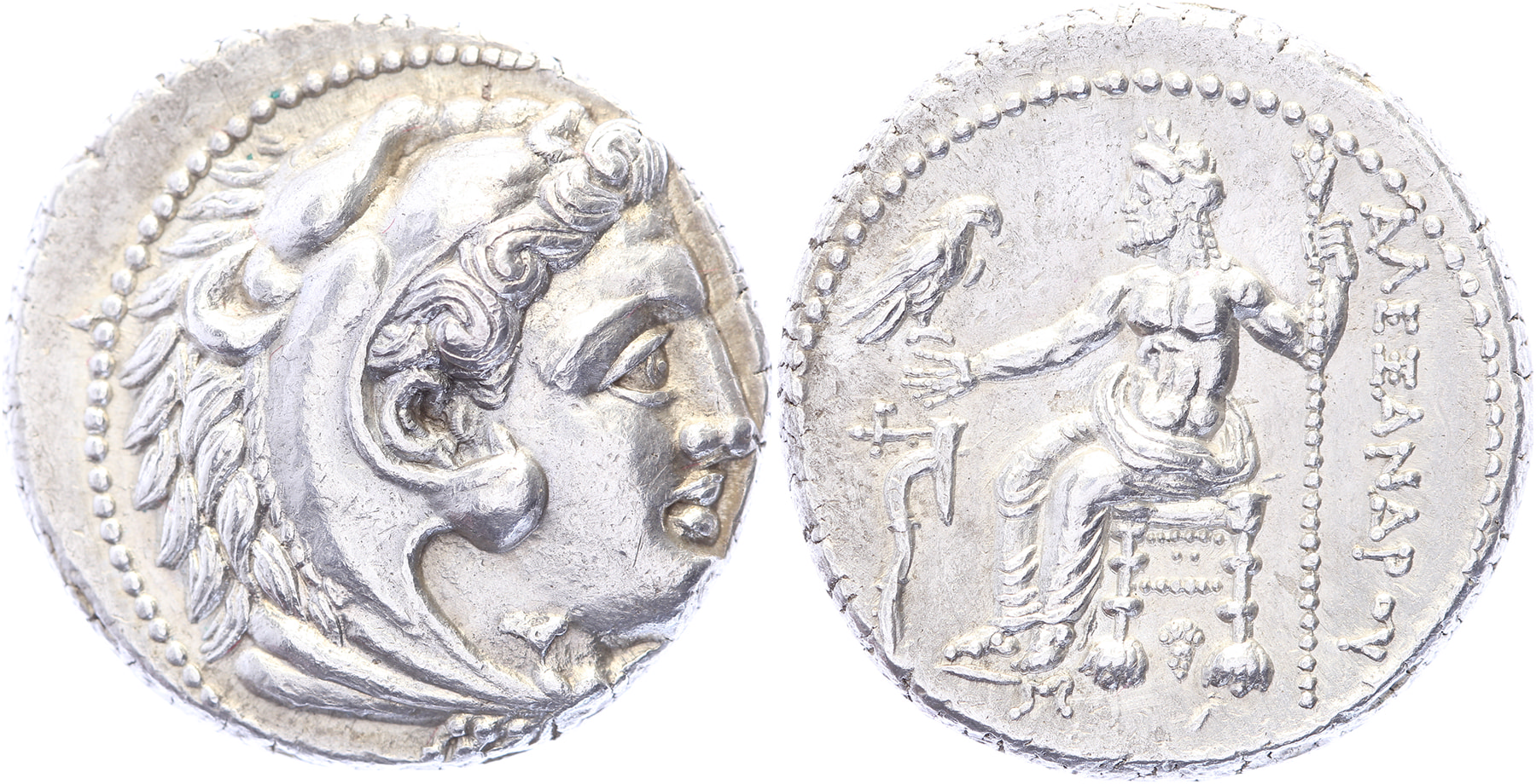 AR Tetradrachm [17,23 gm, 26,3 mm]. Tarsos mint. Struck 327-323 BC. Head of youthful Herakles to right, wearing lion’s skin headdress / ΑΛΕΞΑΝΔΡΟΥ, Zeus Aëtophoros seated left on backless throne, holding eagle in his right hand and lotos tipped scepter in his left; to left, plow; below throne, bunch of grapes; above strut, pellet. Price 3026. Well struck struck in high relief, EF.Purchased from Dr. Busso Peus Nachf, June 2018