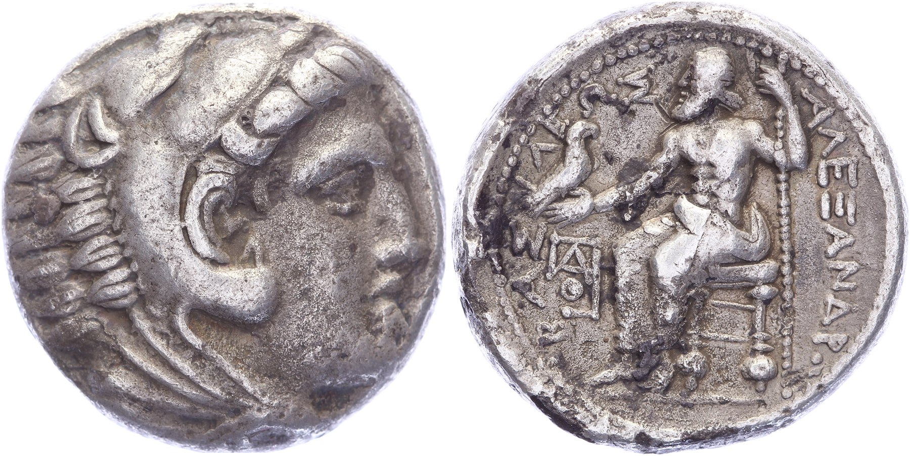AR Tetradrachm [16,67 gm, 24,6 mm]. Amphipolis mint. Struck 327-323 BC. Head of youthful Herakles to right, wearing lion’s skin headdress / ΑΛΕΞΑΝΔΡΟΥ, Zeus Aëtophoros seated left on backless throne, holding eagle in his right hand and lotos tipped scepter in his left; ; monogram in left field. Price 121a. A bit rough, toned VF.