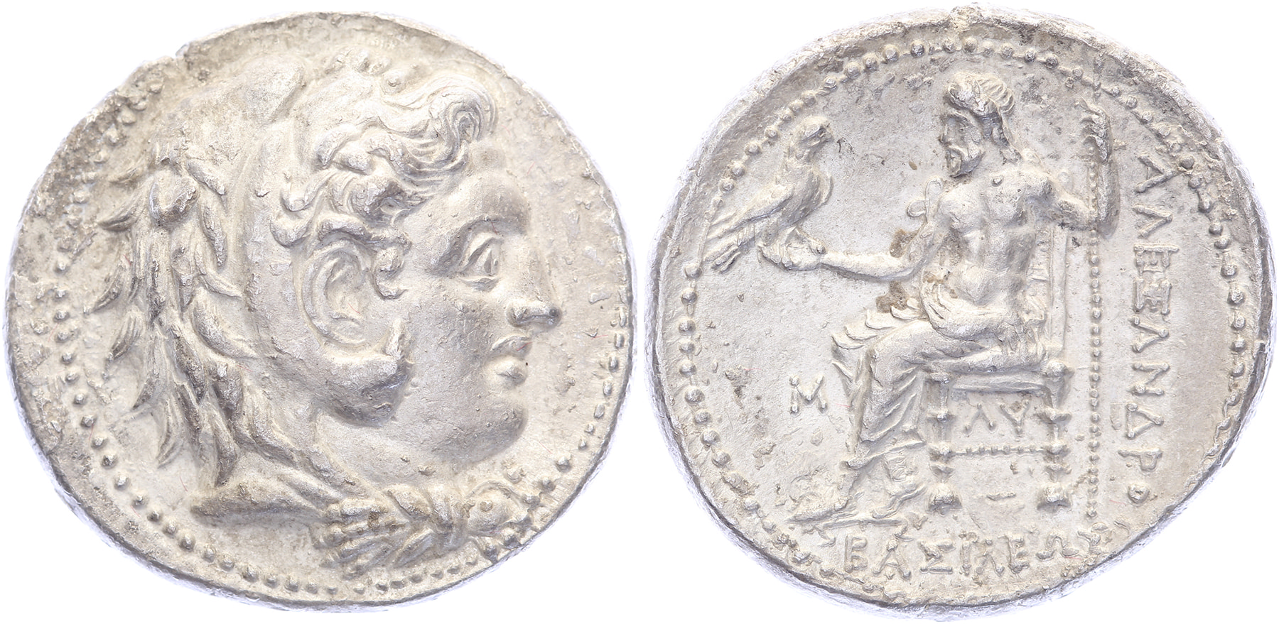 AR Tetradrachm [17,07 gm, 28,1 mm]. Babylon, struck under Archon, Dokimos, or Seleukos I, circa 323-318/7 BC. Head of Herakles to right, wearing lion skin headdress / ΒΑΣΙΛΕΩΣ AΛEΞANΔPOY, Zeus Aëtophoros seated left on low throne, holding long scepter in his left hand and eagle standing right with closed wings in his right; to left, M; below throne, ΛY. Price 3692. aEF.