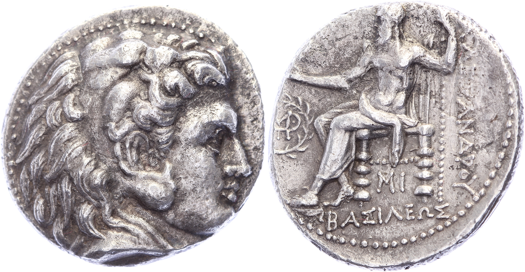 AR Tetradrachm [16,51 gm, 25,8 mm]. Babylon I mint. Struck under Seleukos I, circa 311-300 BC. Head of Herakles to right, wearing lion skin headdress / ΒAΣIΛEΩΣ - AΛEΞANΔPOY, Zeus Aëtophoros seated left on low throne, holding long scepter in his left hand and eagle standing right with closed wings in his right; to left, monogram within wreath; below throne, MI. Price 3747; SC 82.5b. Toned VF.Purchased from Gert Boersema, September 2013