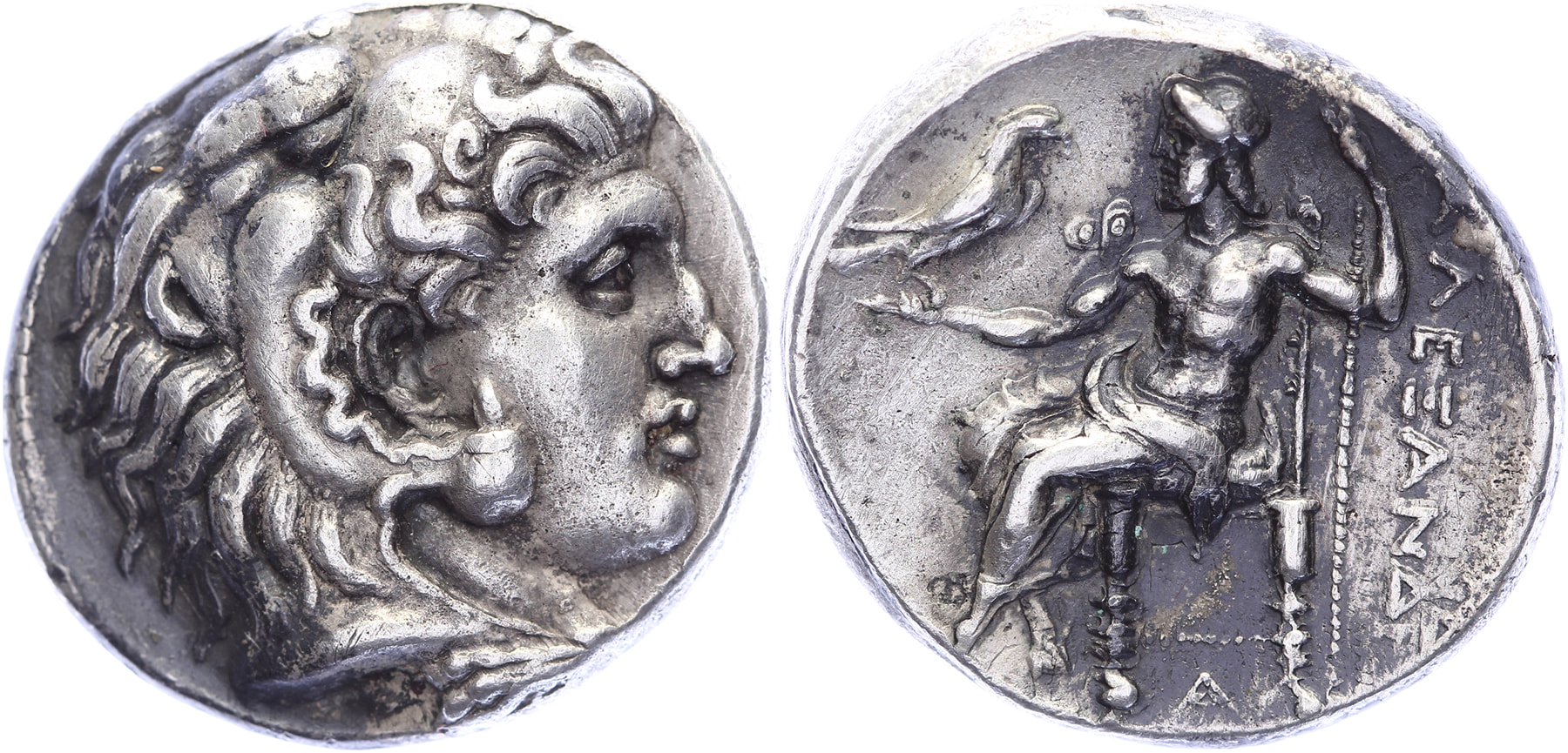 AR Tetradrachm [16,83 gm, 25,2 mm]. Arados mint. Struck under Menes, circa 325/4-324/3 BC. Head of Herakles right, wearing lion skin / AΛEΞANΔP[OY], Zeus Aëtophoros seated left; AP (civic) monogram below throne. Price 3305. Reverse die shift, toned gVF.Purchased from Tom Vossen, March 2003
