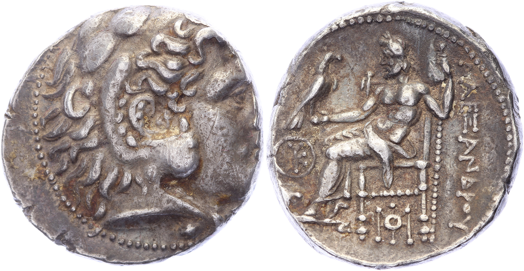 AR Tetradrachm [16,89 gm, 25,6 mm]. Sardeis mint. Struck under circa 301-297 BC. Head of Herakles to right, wearing lion skin headdress / AΛEΞANΔPOY, Zeus Aëtophoros seated left on low throne, holding long scepter in his left hand and eagle standing right with closed wings in his right; to left, monogram within circle; below throne; monogram below throne. Price 3747; SC 82.5b. Obverse off centre, toned VF.Purchased from MPO, September 2013