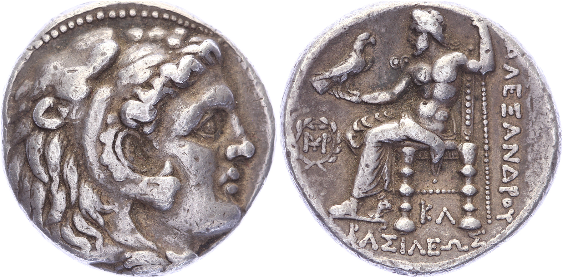 AR Tetradrachm [17,04 gm, 25,7 mm]. Babylon I, struck under Peithon, circa 315-311 BC. Head of Herakles to right, wearing lion skin headdress / ΒAΣIΛEΩΣ – AΛEΞANΔPOY, Zeus Aëtophoros seated left on low throne, holding long scepter in his left hand and eagle standing right with closed wings in his right; to left, monogram within wreath; below throne, KΛ. Price 3713.  Few minor marks, toned VF.Purchased from Datema, September 2021 (Beurs Berkel-Enschot coin fair)