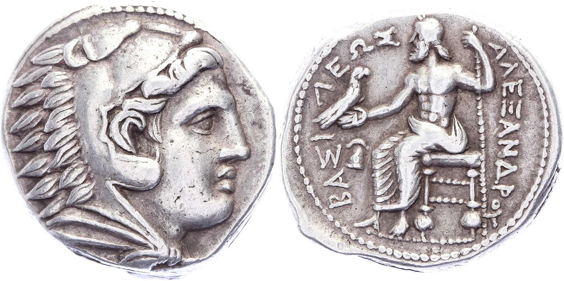 AE Tetradrachm [17,18 gm, 25,1 mm]. Amphipolis, struck under Antipater, circa 322-320. Head of Herakles to right, wearing lion skin headdress / BAΣIΛEΩΣ AΛEΞANΔPOY, Zeus Aëtophoros seated left on low throne, holding long scepter in his left hand and eagle standing right with closed wings in his right; to left, Macedonian helmet. Price 113. Toned gVF.
