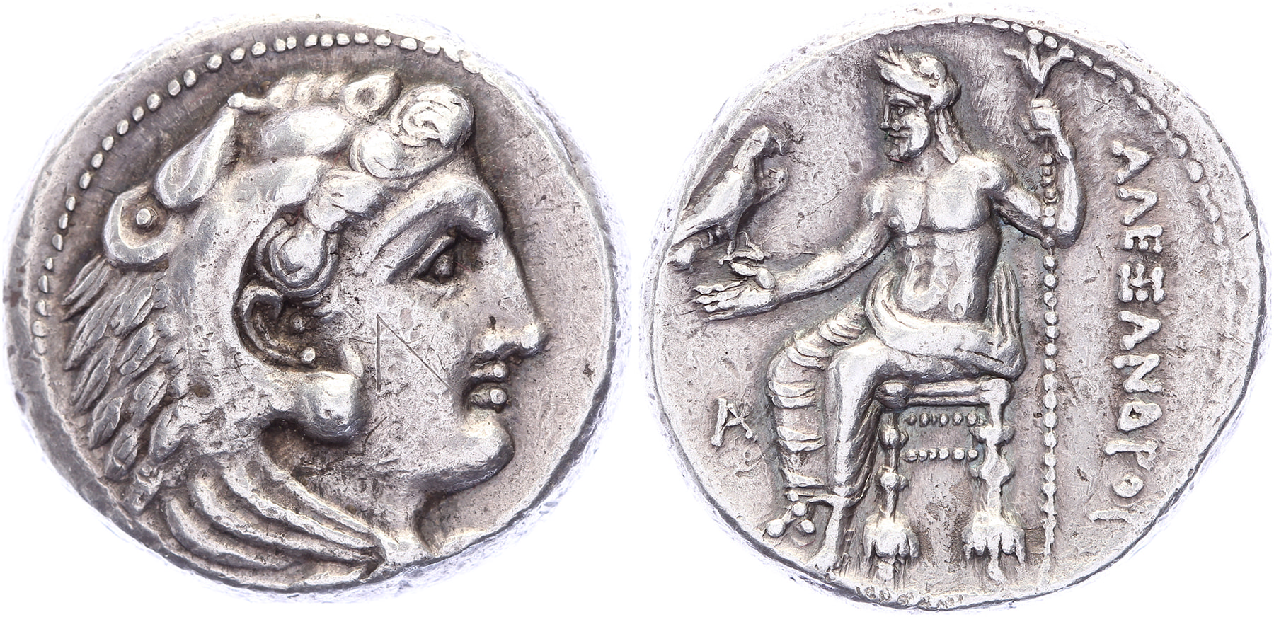 AR Tetradrachm [17,2 gm, 24,3 mm]. Arados mint. Struck under Ptolemy I as satrap, circa 320-319. Head of Herakles to right, wearing lion skin headdress / AΛEΞANΔPOY, Zeus Aëtophoros seated left on low throne, holding long scepter in his left hand and eagle standing right with closed wings in his right; to left, AP. Price 3426 (‘Byblos’). Obverse griffiti on cheek, gVF.Purchased from Germania Inferior Numismatica, June 2016