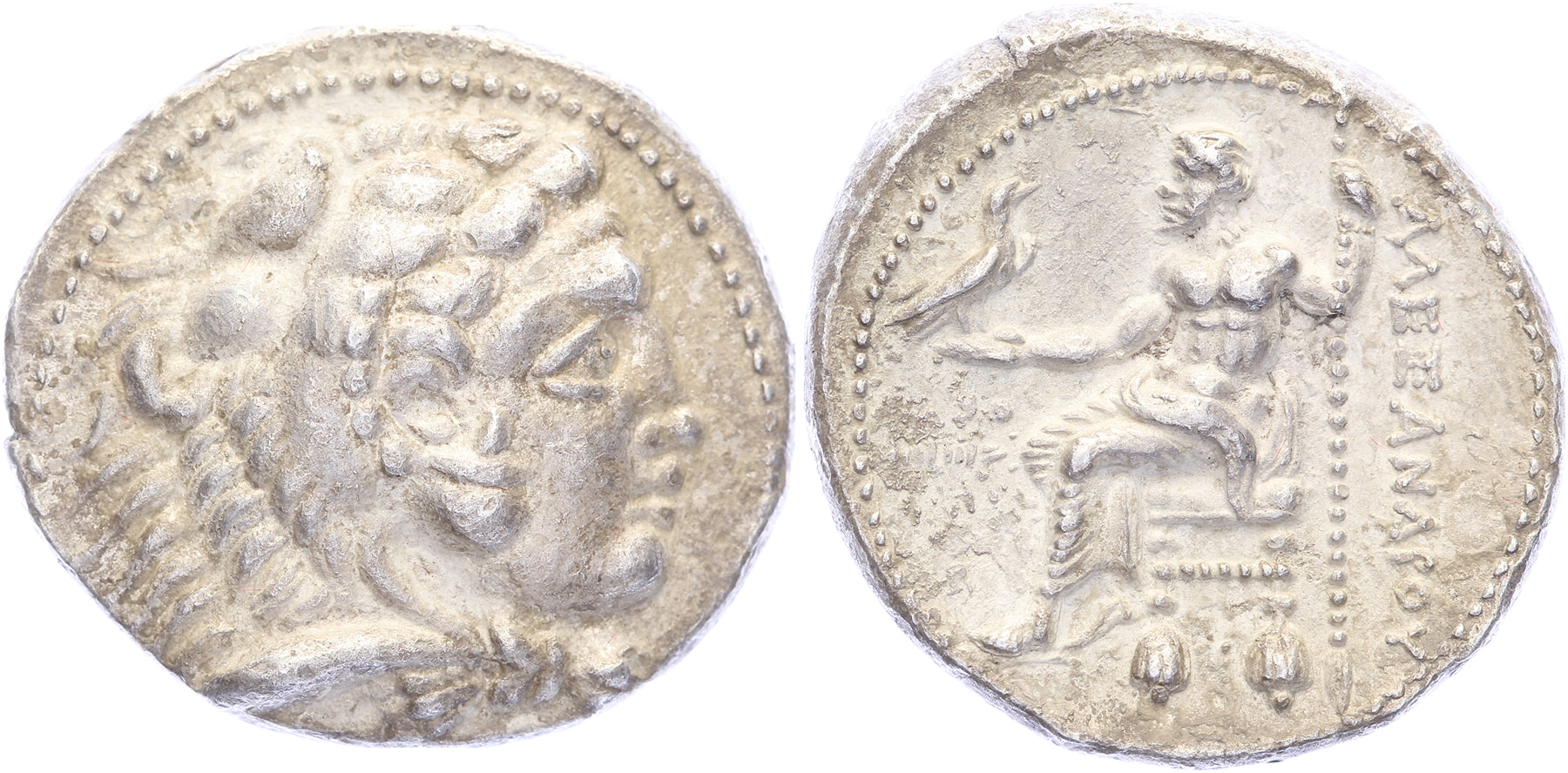 AR Tetradrachm [17,12 gm, 26,7 mm]. Dated RY 28 of Azemilkos (322/1 BC). Head of Herakles right, wearing lion skin headdress / AΛEΞANΔPOY, Zeus Aëtophoros seated left, holding sceptre; ΑΛΕΞΑΝΔΡΟΥ to right, date to left, Phoenician A below throne. Price 3272 (Ake); Newell, Dated 29; DCA 737. Nice VF.