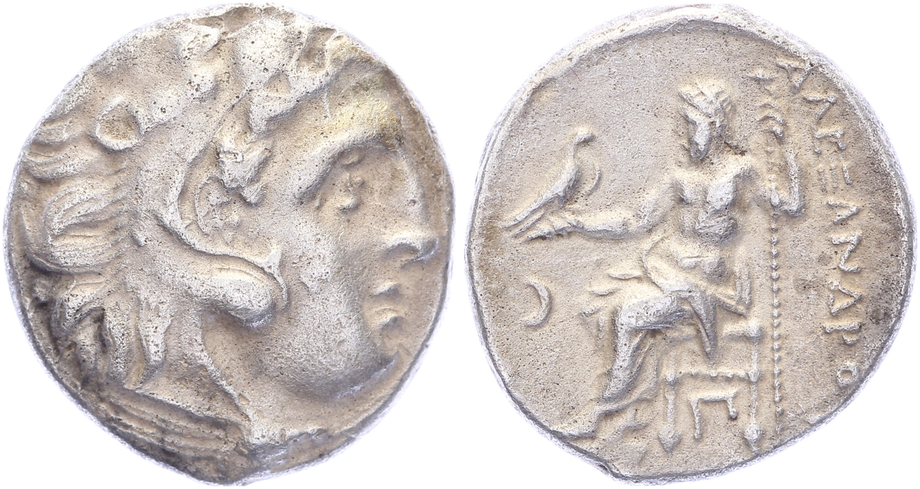 AR Drachm [4,35 gm, 15,9 mm]. Kolophon mint. Struck under Antigonos Monopthalmos, 310-301 BC. Head of Herakles right, wearing lion skin / ΑΛΕΞΑΝΔΡΟ[Υ], Zeus Aëtophoros seated left; crescent in left field, Π below throne. Price 1813. A bit porous, VF.Purchased from Marcantica, February 2021