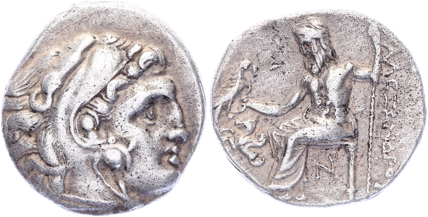 AR Drachm [4,17 gm, 16,5 mm]. Lampsakos mint. Struck circa 310-301 BC. Head of Herakles right, wearing lion skin headdress / ΑΛΕΞΑΝΔΡΟΥ, Zeus Aëtophoros seated left, holding eagle and sceptre; pegasos protome in left field, monogram below throne. Price 1382; Müller 612. Minor porosity, lightly toned gVF.