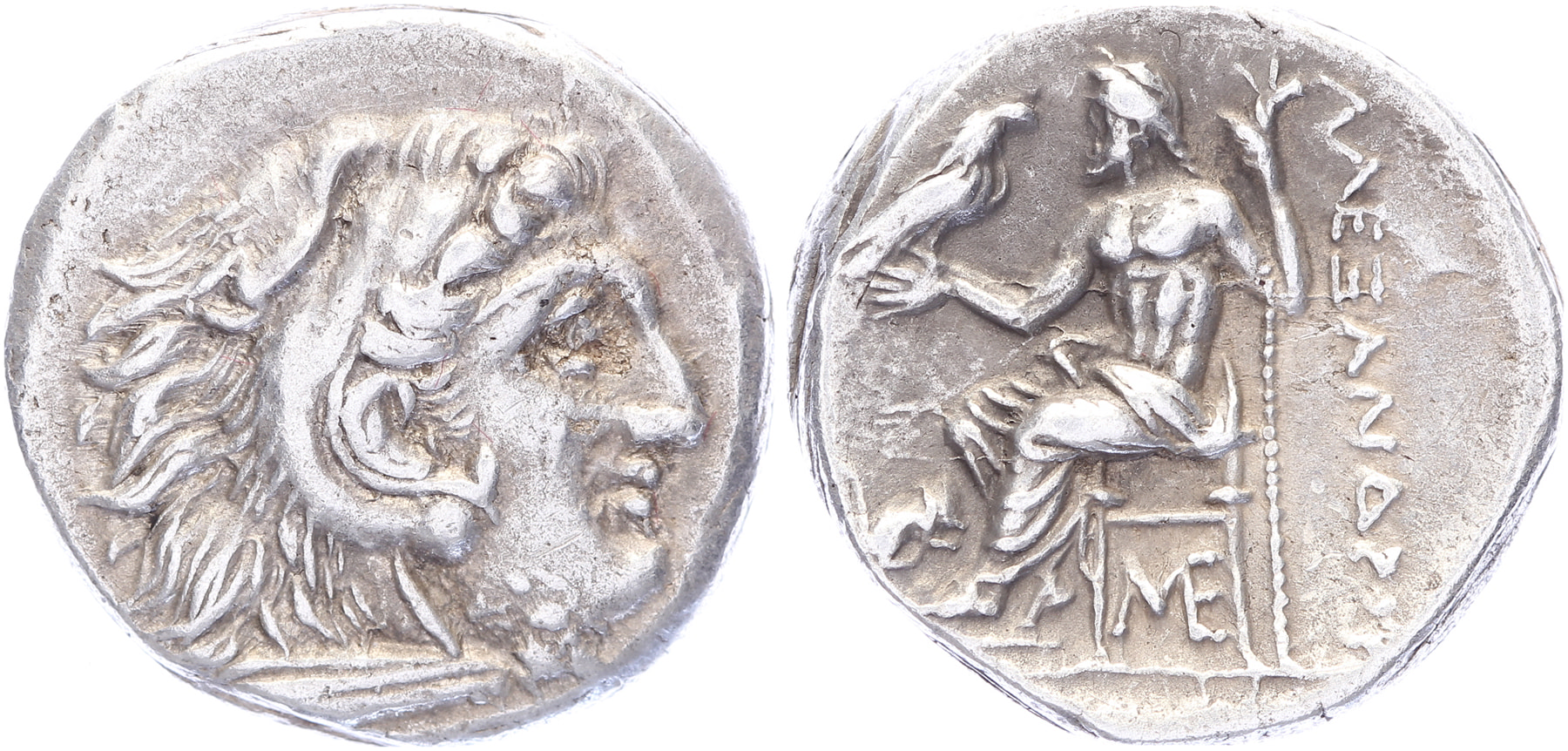 AR Drachm [4,23 gm, 17,1 mm]. Lampsakos mint. Struck under Antigonos I Monophthalmos 320-301 BC. Head of Herakles right, wearing lion’s skin headdress AΛEΞANΔPOY, Zeus Aëtophoros seated left with eagle and sceptre; ME monogram below throne; mouse in field left. Price 1423. Lightly toned gVF.Purchased from Jan Ruijs, 2019