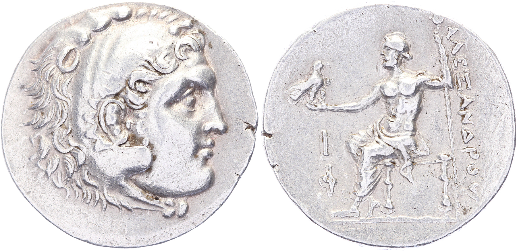 AR Tetradrachm [16,74 gm, 31,4 mm]. Phaselis mint. Civic issue, dated CY 10 (209/8 BC). Head of Herakles right, wearing lion’s skin headdress / AΛEΞANΔPOY, Zeus Aëtophoros left, holding eagle and sceptre; I (date) above Φ in left field. Price 2847. gVF.Purchased from Tom Vossen, March 2016