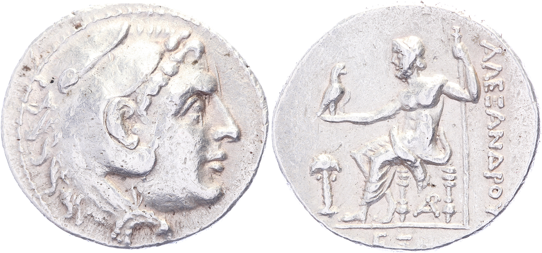 AR Tetradrachm [17,07 gm, 30,7 mm]. Dated CY 65 (195/4 BC). Phoenicia, Arados mint. Head of Herakles right, wearing lion skin / ΑΛΕΞΑΝΔΡΟΥ, Zeus Atophoros seated left; palm tree in left field, AP monogram below throne; date in exergue. Price 3398. gVF.Purchased from Tom Vossen, March 2016