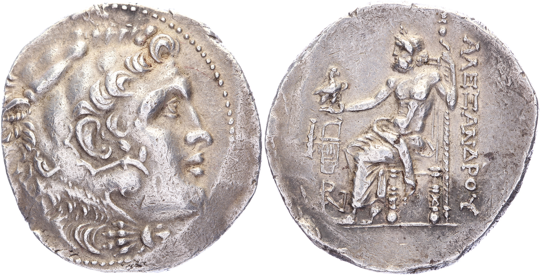 AR Tetradrachm [17,20 gm, 29,7 mm]. Erythrai mint. Struck 215-190 BC. Head of Herakles to right, wearing lion skin headdress; countermark, anchor / AΛEΞANΔPOY Zeus Aëtophoros seated left; on low throne, holding long scepter in his left hand and eagle standing right with closed wings in his right; Zeus Aëtophoros seated left; in left field, club and bow-in-bowcase above APY monogram. Price 1907. Few faint scratches and marks, nice VF.