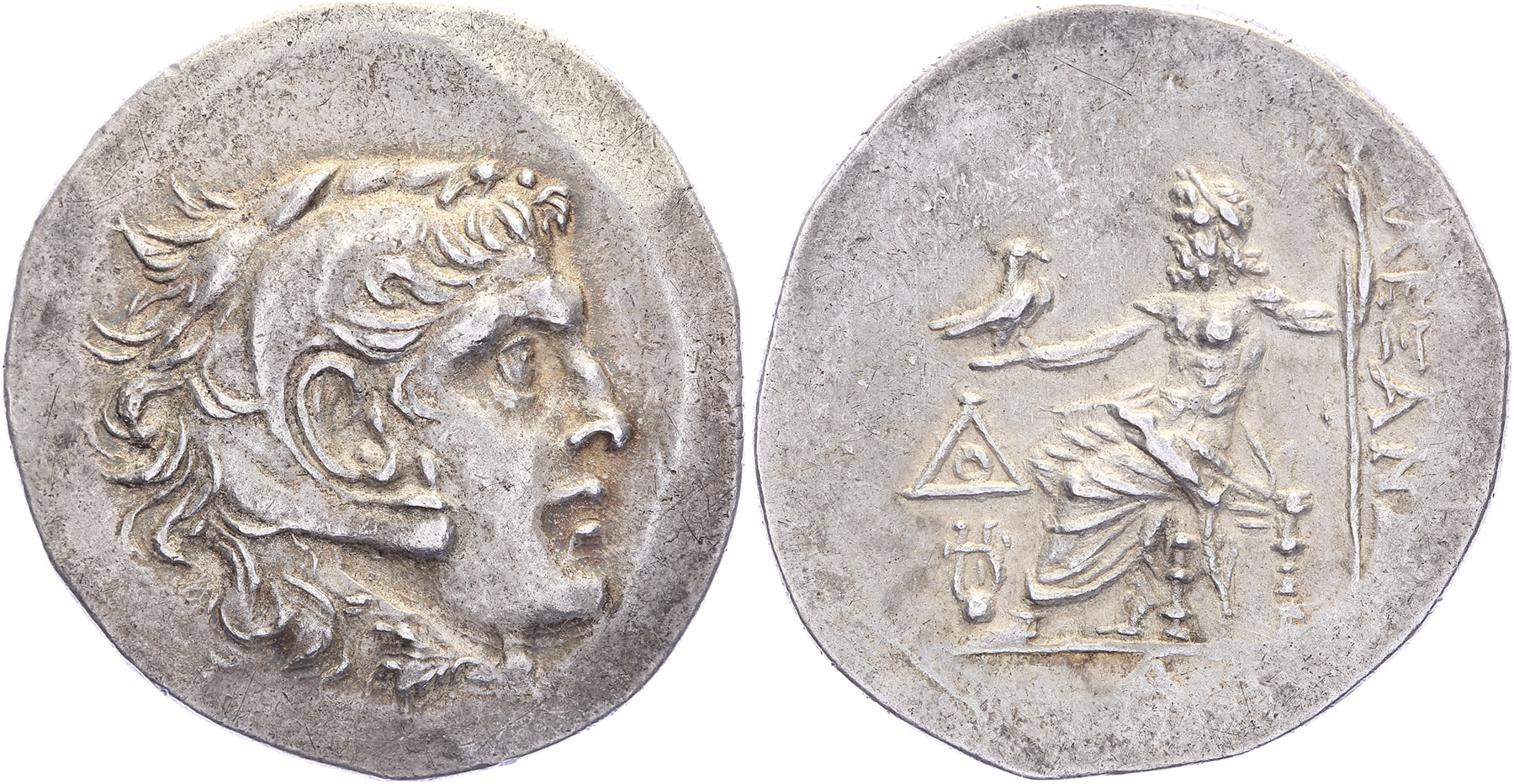 AR Tetradrachm [16,52 gm, 34,6 mm]. Mytilene mint. Civic issue, struck circa 188-170 BC. Head of Herakles right, wearing lion skin / / AΛEΞANΔPOY, Zeus Aëtophoros seated left; in left field, monogram above chelys; Δ in exergue. Price 1729. Lightly toned.gVF. Purchased from J. Elsen, February 2002, Auction 69, lot 148