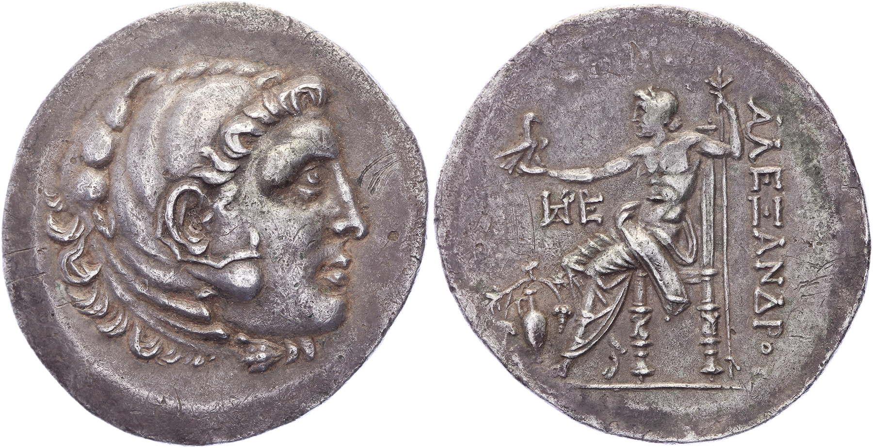 AR Tetradrachm [16,23 gm, 32,1 mm]. Temnos mint. Civic issue. Circa 188-170 BC. Head of Herakles to right, wearing lion skin headdress / ΑΛΕΞΑΝΔΡΟΥ, Zeus Aëtophoros seated to left, holding sceptre; AΛEΞANΔPOY to right, vine-tendril with grapes around an oinochoe to left, monogram above. Price 1678. Some scratches and marks, toned VF.