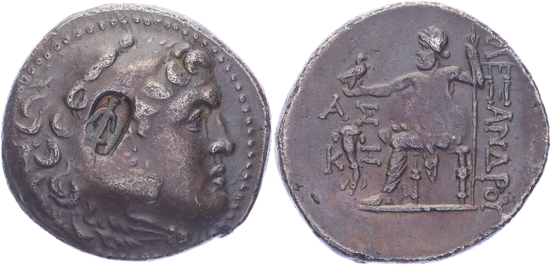 AR Tetradrachm [16,66 gm, 29,2 mm]. Aspendos mint. Dated CY 27 (186/5 BC). Head of Herakles to right, wearing lion skin headdress; countermark, anchor / AΛEΞANΔPOY, Zeus Aëtophoros seated left on low throne, holding long scepter in his left hand and eagle standing right with closed wings in his right; EΣTI in left field; monogram on throne. Price 2909. Dark toning, VF. Purchased from Marcantica, February 2021