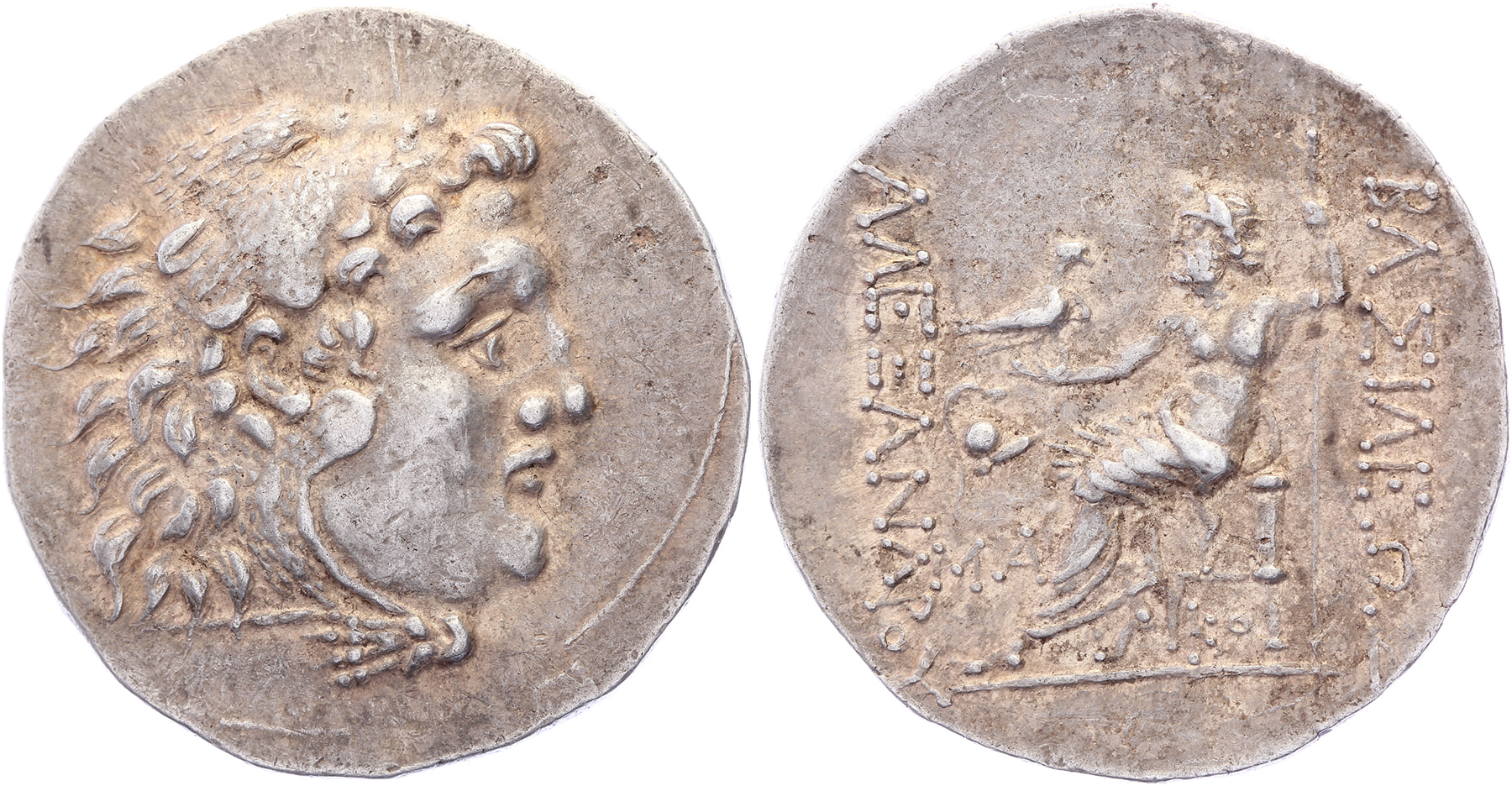 AR Tetradrachm [16,70 gm, 33,7 mm]. Mesembria mint. Struck circa 175-150 BC. Head of Herakles right, wearing lion’s skin headdress / BAΣIΛEΩΣ AΛΕΞΑΝΔΡΟΥ, Zeus Aëtophoros seated left, holding eagle and sceptre; Corinthian helmet and MA in left field, KO below throne. Price 1077; Callatay Group 2 (D2 / but unlisted reverse die); Müller 482. Toned gVF.Purchased from Germania Inferior Numismatica, March 2017; Ex Jesus Vico, june auction (2016)