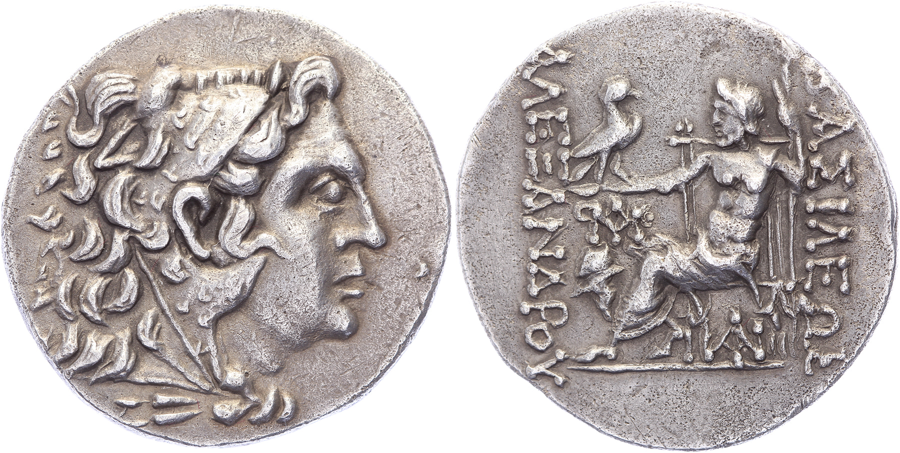 AR Tetradrachm [16,08 gm, 30,6 mm]. Mesembria mint. Struck circa 90-early 60s BC. Head of Herakles in lion skin headdress to right / BAΣIΛEΩΣ – AΛEΞANΔΡOΥ, Zeus seated left on high-backed throne, holding eagle in his right hand and long scepter in his left; to left, monogram above helmet; below throne; monogram. Price 1106A. Rare variant. Few marks and minor porosity, toned gVF. Purchased from Jeff Young, February 2001