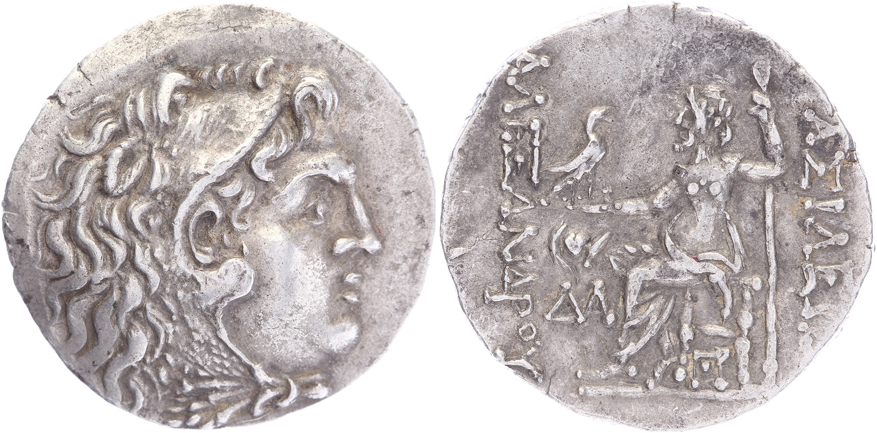 AR Tetradrachm [16,49 gm, 29,5 mm]. Mesembria mint. Struck circa 125-100 BC. Head of Herakles to right, wearing lion skin headdress / [Β]ΑΣΙΛΕΩ[Σ] - AΛEΞANΔPOY Zeus seated left on low throne, holding long scepter in his left hand and eagle standing right with closed wings in his right; in inner left field, Corinthian helmet above ΔA; below throne, monogram. Price 1070. gVF.Purchased from Bertolami Fine Arts Londen, September 2017