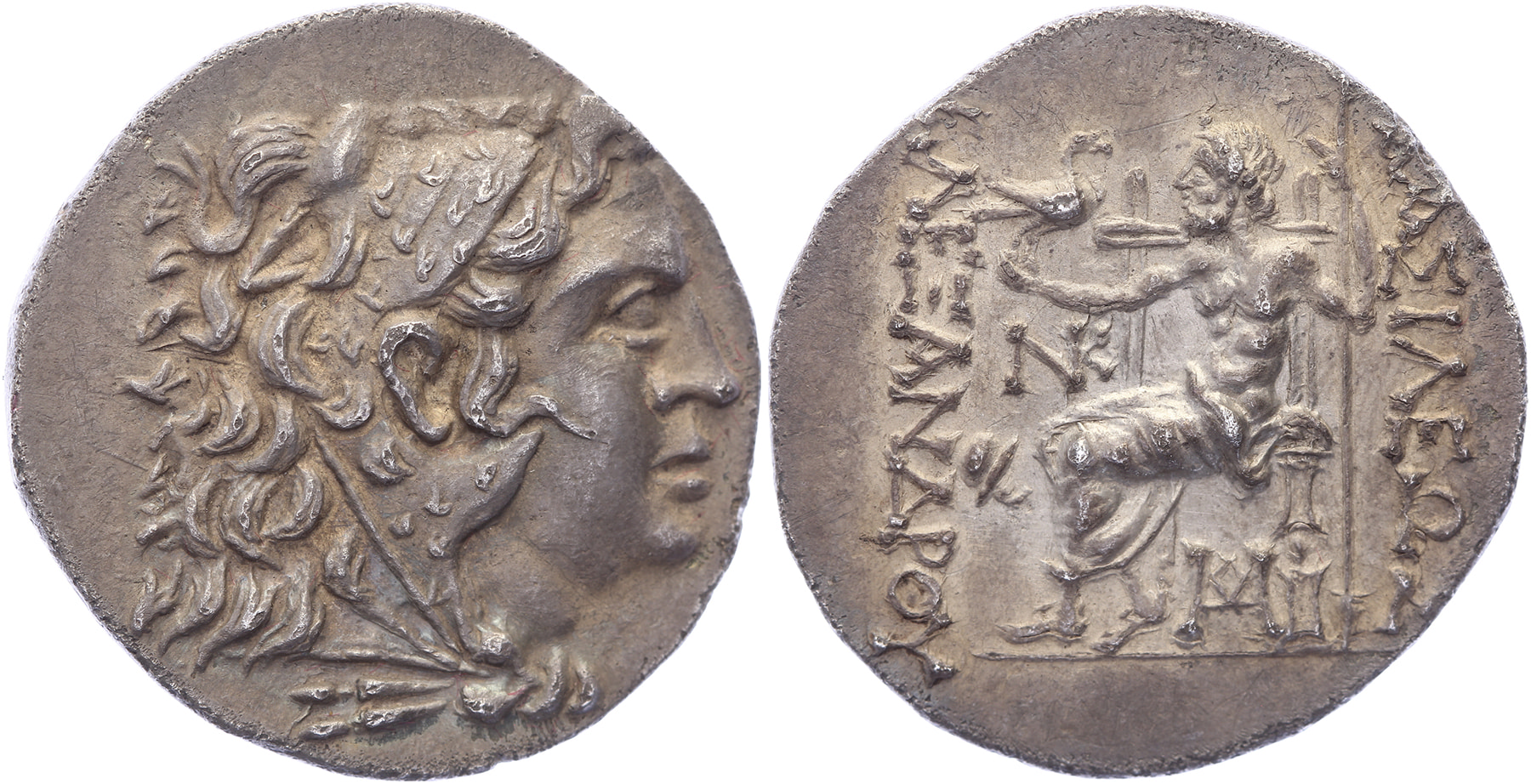 AR Tetradrachm [15,91 gm, 30,2 mm]. Mesembria mint. Circa 125-65 BC. Head of Herakles right, wearing lion skin / BAΣIΛEΩΣ / AΛΕΞΑΝΔΡΟΥ, Zeus Aëtophoros seated left on throne, holding eagle and sceptre. Controls: In inner left field, monogram above helmet right; monogram below throne. Price 1117. gVF.Purchased from Ingemar Wallin Utveckling AB, 2018; Ex Numismatik Naumann Auction 56, lot 82