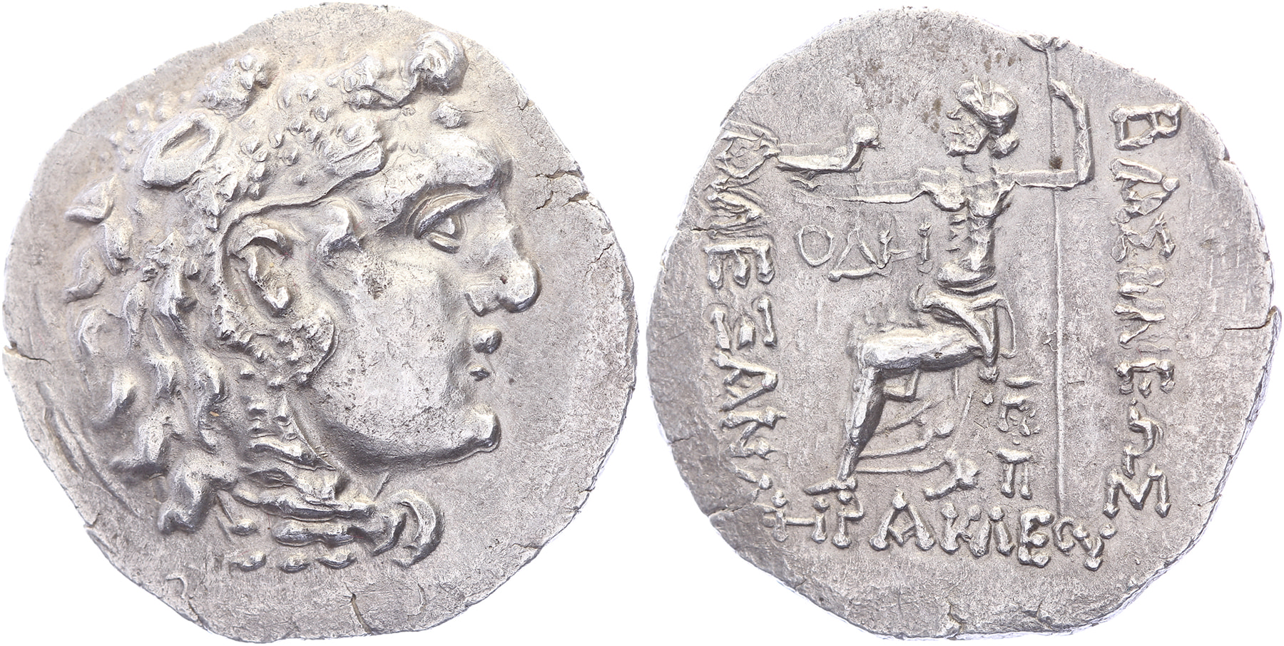 AR Tetradrachm [16,30 gm, 31,8 mm]. Odessos mint. Struck circa 125-70 BC. Head of Herakles right, wearing lion skin / BAΣIΛEΩΣ / AΛΕΞΑΝΔΡΟΥ, Zeus Aëtophoros seated left on throne, holding eagle and sceptre. Controls: OΔH to inner left; HPAKΛEOY in exergue. Price 1208. Reverse slight die shift, gVF.