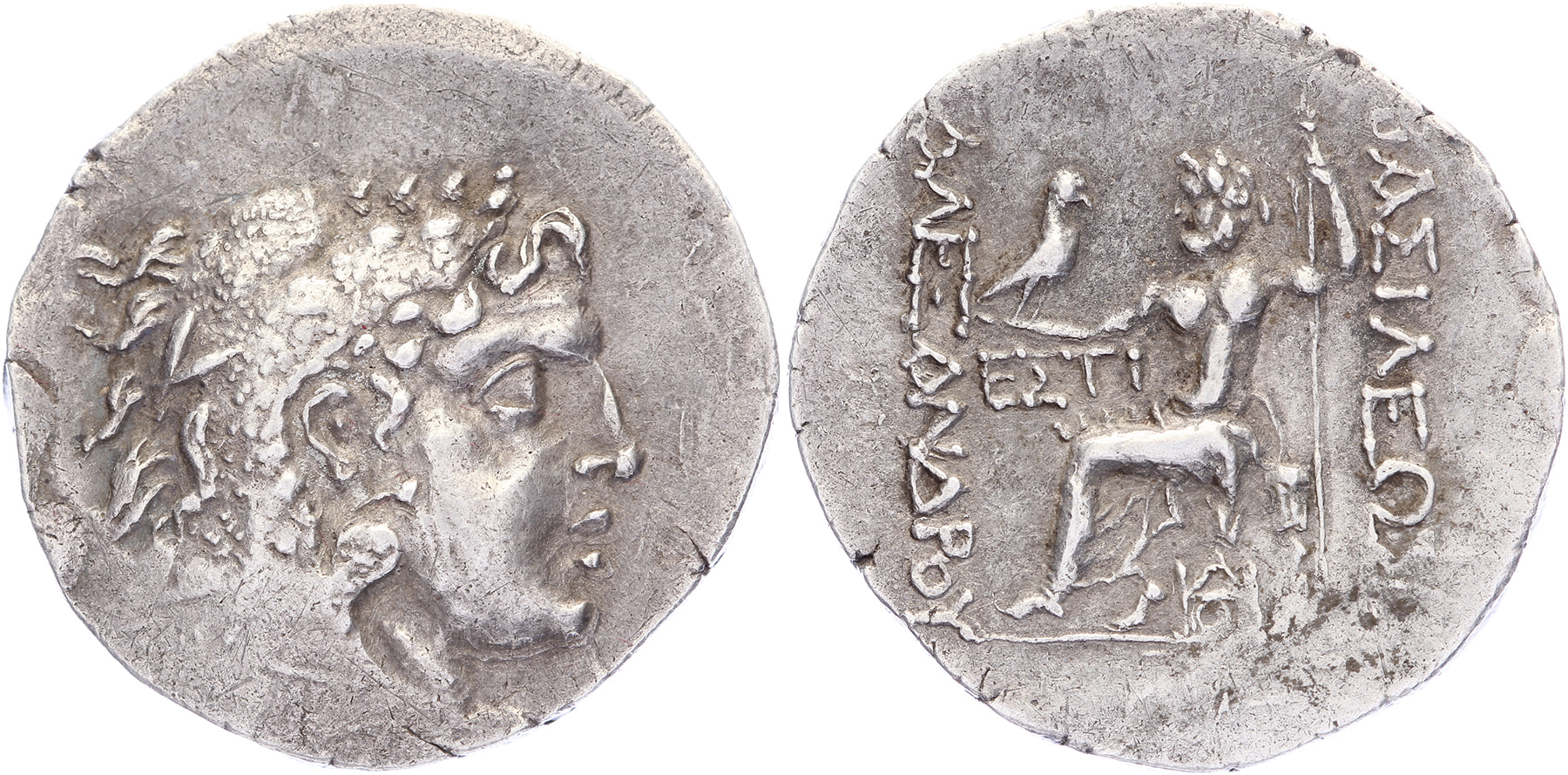 AR Tetradrachm [16,40 gm, 29,6 mm]. Odessos mint. Struck circa 90-80 BC. Head of Herakles to right, wearing lion skin headdress / BAΣIΛEΩΣ - AΛEΞANΔPOY Zeus seated left on low throne, holding long scepter in his left hand and eagle standing right with closed wings in his right; EΣTI in left field; monogram on throne. Price 1205; Callataÿ group 2, dies D2/R1a ; Topalov, Odesos 93. Lightly toned gVF.
