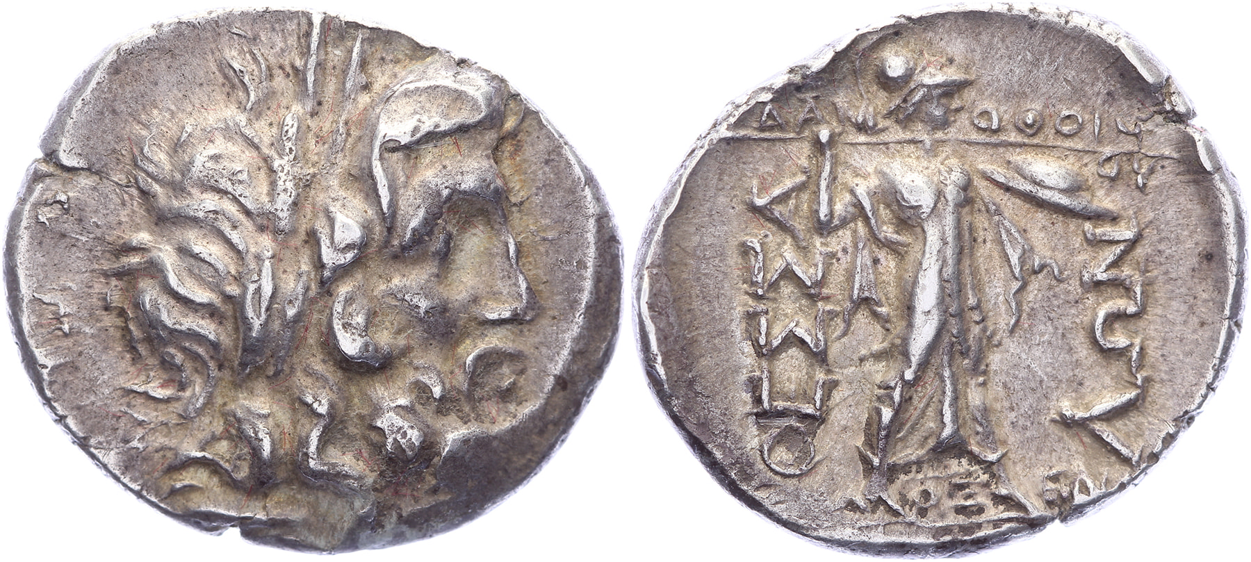 Mid – late 1st century BC. AR Stater [6,25 gm, 22,4 mm]. Damothoin(os) and Philox(enides), magistrates. Head of Zeus right, wearing oak wreath / ΘEΣΣA/ΛΩN, Athena Itonia striding right, hurling spear held in her right hand, shield on her left arm; ΔAM-OΘOI/N above spear with last letter below, ΦI-ΛO-ΞΛENI ( sic ) across lower central field. McClean 4726 var. (legends). Toned VF.Purchased from E. van de Brul, September 1994 (Berkel Enschot coin fair)