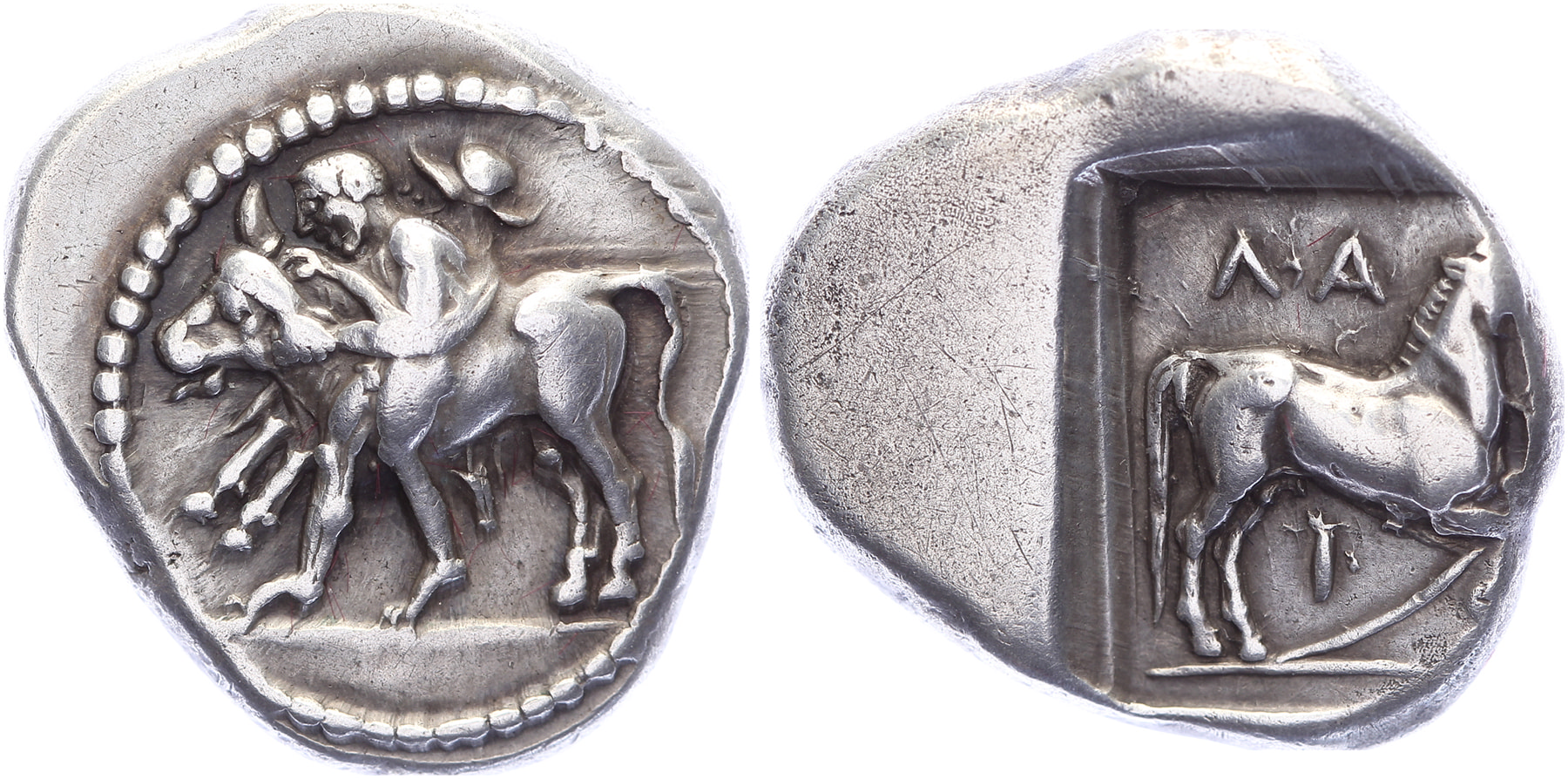 Circa 460-420 BC. AR Drachm [6,18 gm, 17,8 mm]. Thessalos, petasos and cloak tied at neck, holding band across horns of bull left / ΛA / [ᴙ] I, horse running right, trailing reins, within incuse square.BCD Thessaly II 354.1. Reverse off centre, gVF.Purchased from Gijs Henzen, April 1999, list april #63