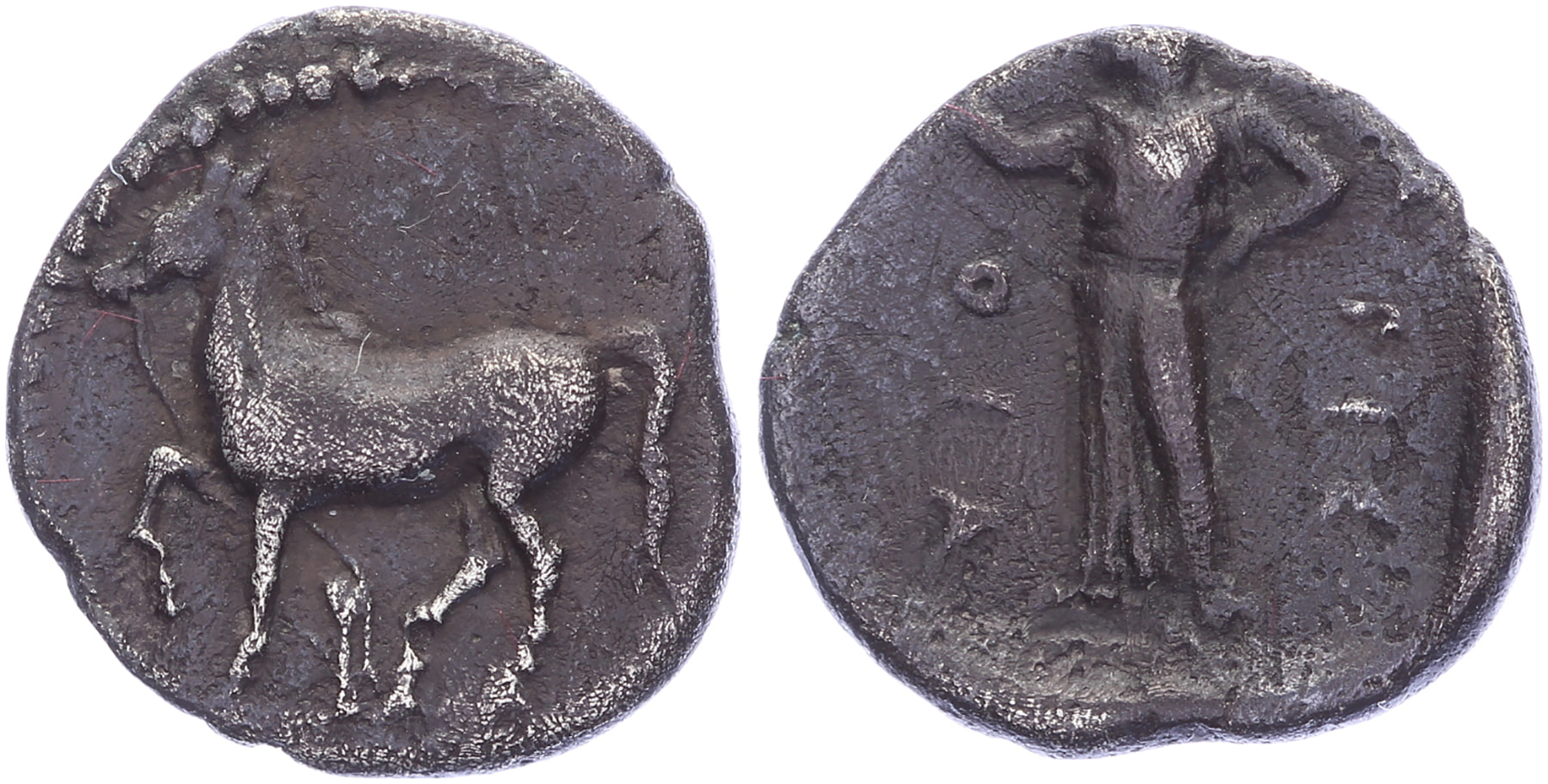 Circa 400 BC. AR Obol [0,92 gm, 11,6 mm]. ΣO Horse walking to left / ΛAΡIΣ-ΣA, the nymph Larissa standing on ground line facing, her head turned right, in her raised right hand she holds a wreath and in her lowered left a ball. BCD II 363.2 (same dies). Slightly porous, off centre, toned aVF.Purchased from Münzhandlung Athena, München, July 2000
