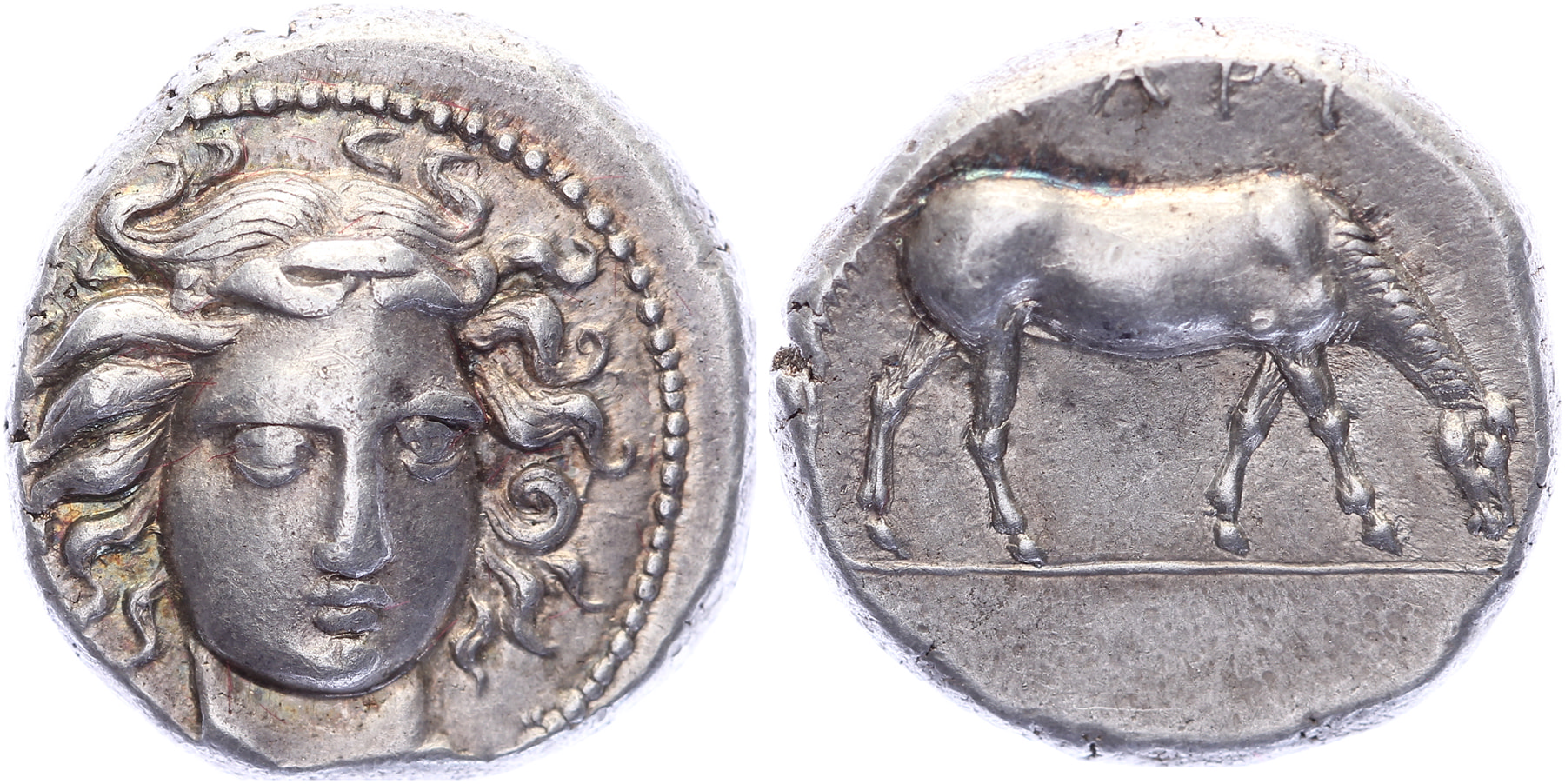 Circa 400-350 BC. AR Drachm [6,24 gm, 17 mm]. Head of nymph Larissa three-quarters right, hair flying freely around face / ΛAΡ, horse grazing right. BCD Thessalony 380 (unlisted dies). gVF.Purchased from F. Javorṡeck, June 1997 (Rotterdam coin fair)