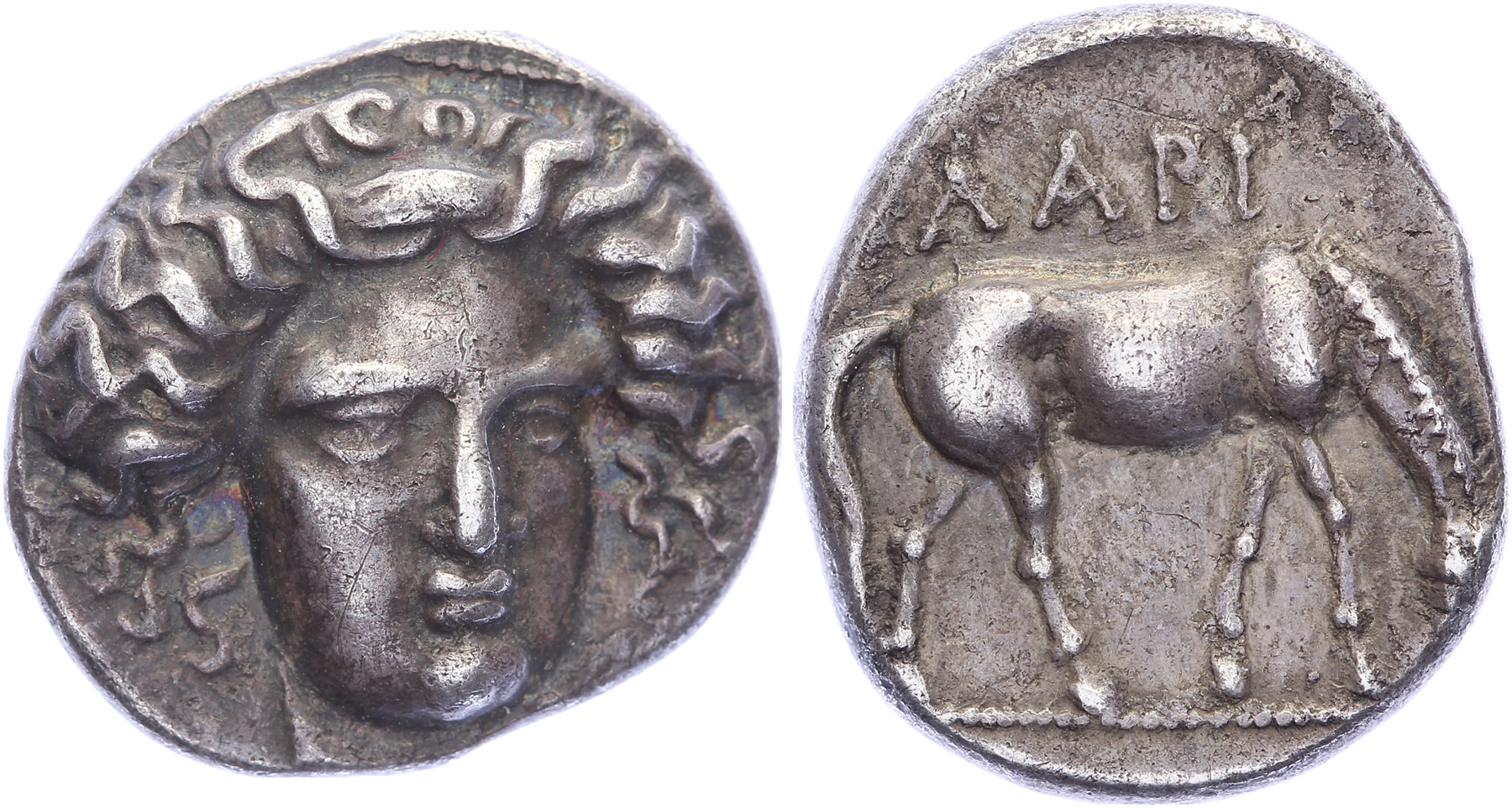 Circa 400-350 BC. AR Drachm [6,07 gm, 19,7 mm]. Head of nymph Larissa three-quarters right, hair flying freely around face / ΛAΡ, horse grazing right. BCD Thessalony 380 (unlisted dies). Toned VF.Purchased from Tom Vossen, September 2013; ex Gorny & Mosch Auction 204, lot 1343 (March 2012)