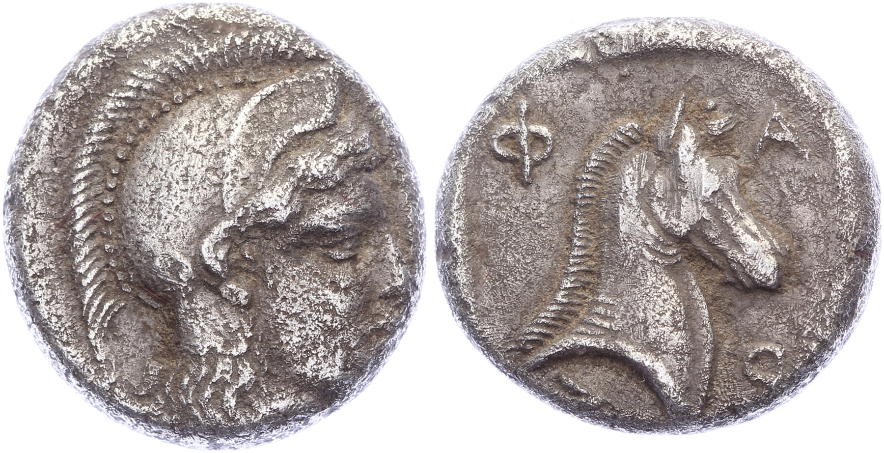 End of 5th century BC. AR Hemidrachme [2,95 gm, 13,1 m]. Head of Athena to right, wearing crested Attic helmet with raised cheek flaps / Φ-A-P-Σ, horse’s head right in concave field. BCD Thessaly II 646. Lavva 56. Rough, VF.Purchased from Agora, November 2020 (Berkel Enschot coin fair)