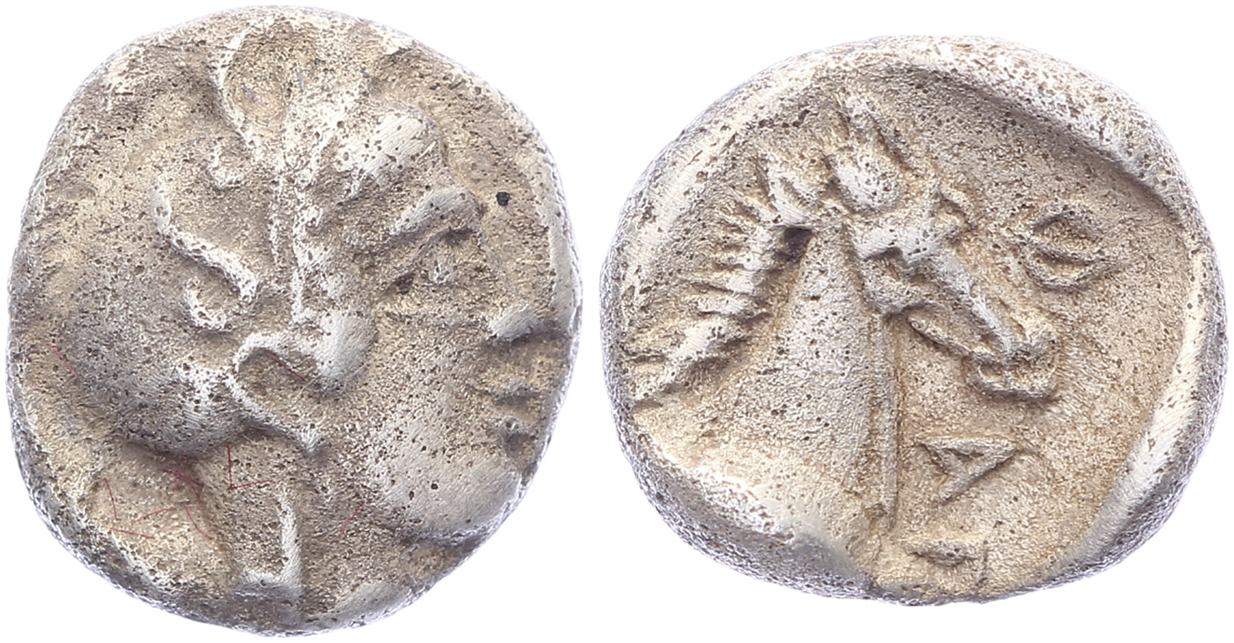 Mid 5th century BC AR Obol [0,89 gm, 9,8 mm]. Helmeted head of Athena right / ΦAP, head of horse right. BCD Thessaly II 627. Porous, gF.Purchased from Tom Vossen, 2005