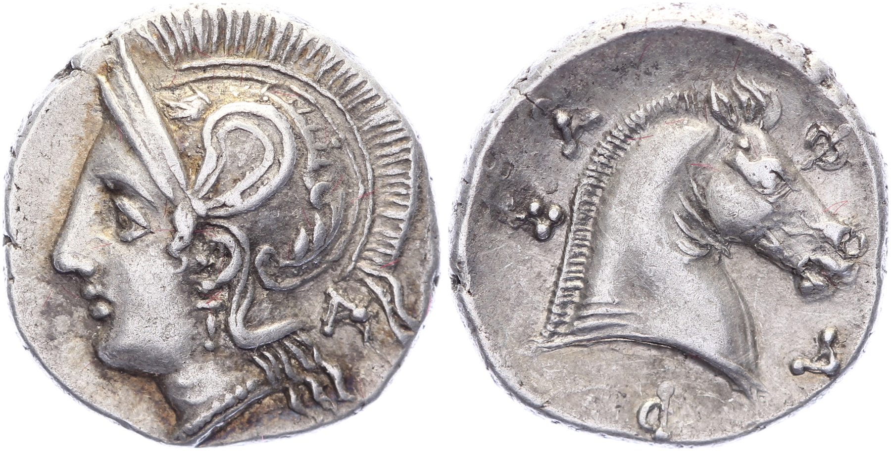 Circa 424-404 BC. AR Hemidrachm [2,81 gm, 15,4]. Head of Athena left, wearing pearl necklace, pendant earring and crested Attic helmet with raised cheek flaps, adorned with scroll and olive twigs; A behind neck / Φ-A-P-ΣA, horse’s head right in flat, slightly concave field. Lavva, Pharsalos 161. aEF. Purchased from H.D. Rauch, Auction 73, lot 229