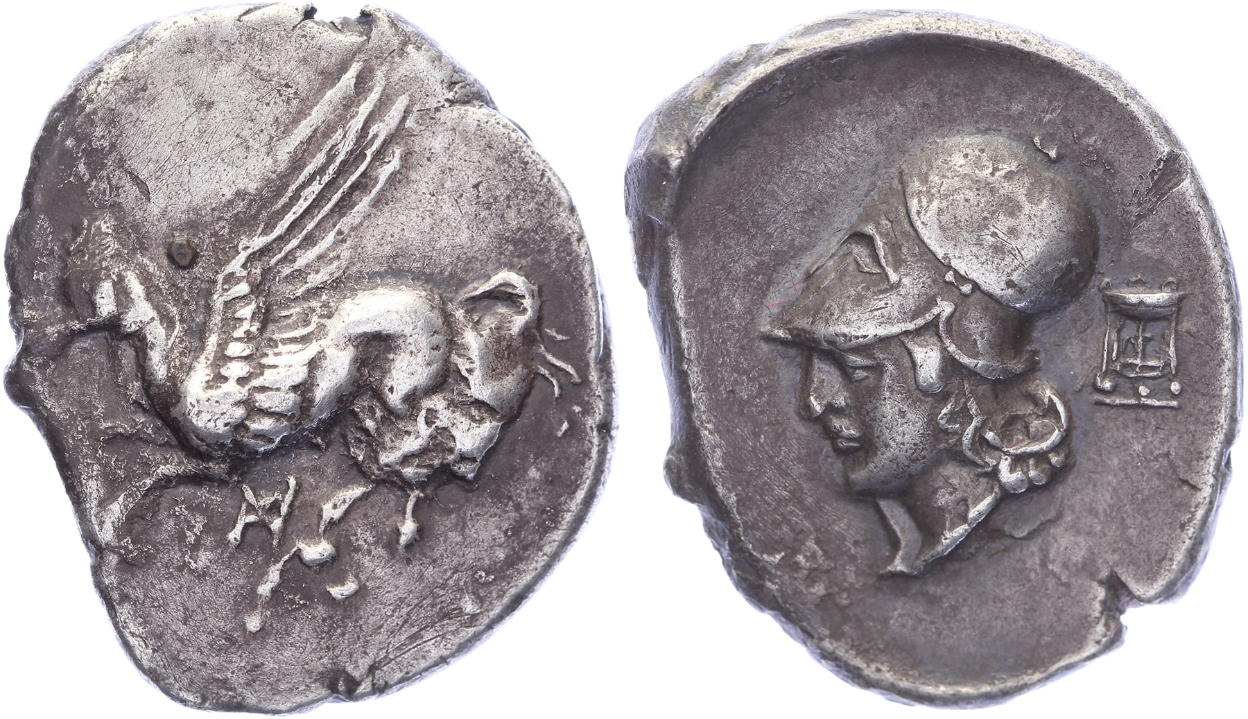 Circa 350-300 BC. AR Stater [8,32 gm, 21,6 mm]. Pegasos flying left; below, monogram / Head of Athena left, wearing Corinthian helmet; tripod behind. Pegasi II p. 488, 19. Obverse die breaks, toned VF.Purchased from Holleman, January 2006, list 142 #235