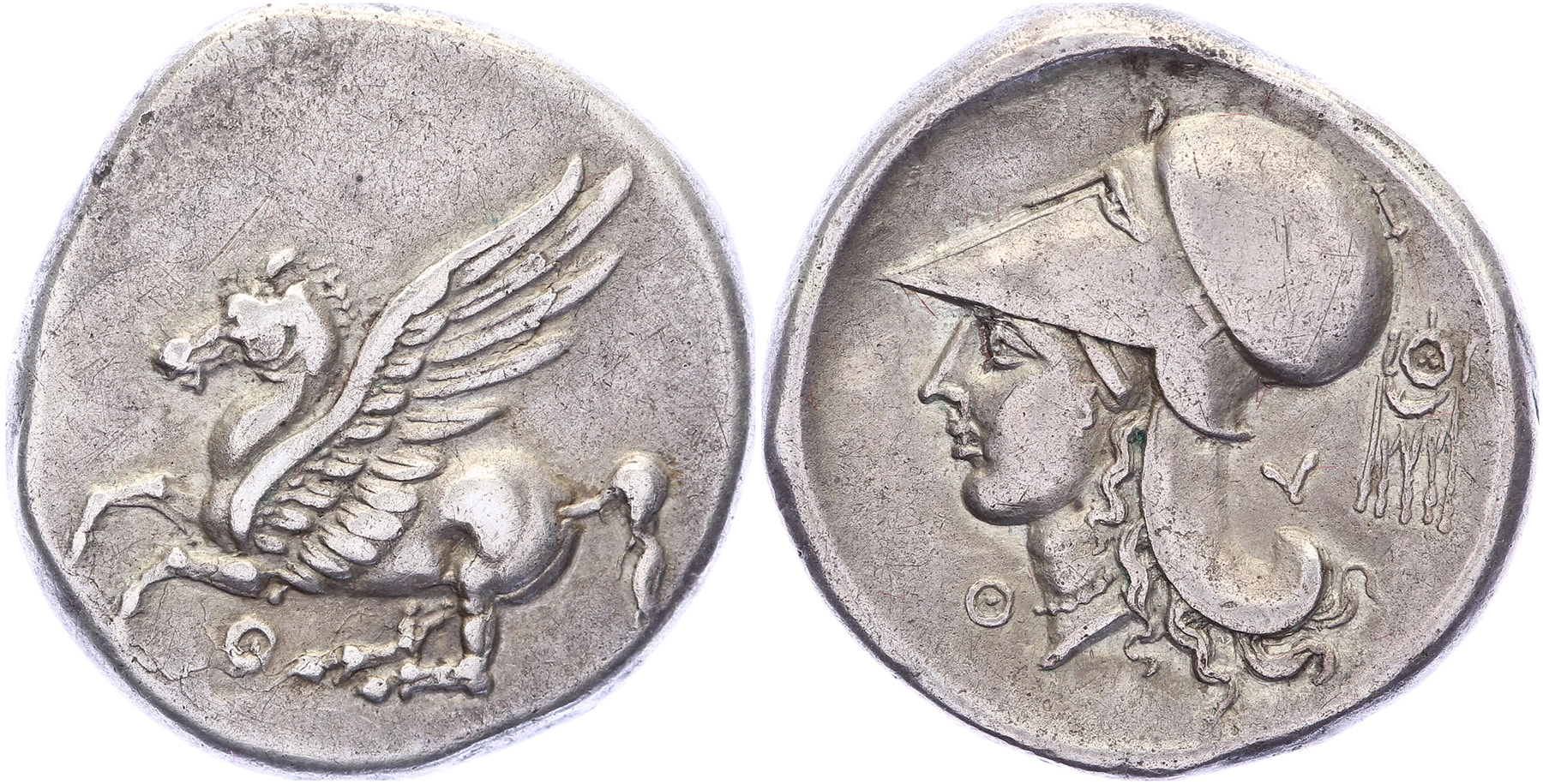 Circa 320-280 BC. AR Stater [8,40 gm, 21,7 mm]. Pegasos flying left; P below / Helmeted head of Athena left; behind, Y and earring with pendants; Θ below chin, ΛY below neck. Pegasi 6 corr. (placement of Θ and Y); BCD Akarnania 373.3 var. (letter below Pegasos). Faint scratches, nice VF.