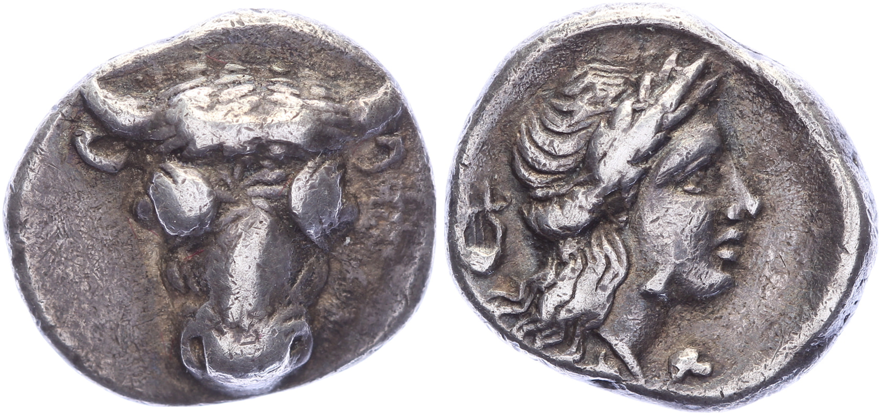 Circa 354-352 BC. AR Triobol [2,75 gm, 14,4 mm]. Time of the Third Sacred War. Struck under Onymarchos. Bull’s head facing / Laureate head of Apollo right, lyre behind, [Φ]-Ω below. BCD Phokis, 294; BMC 81, pl. III, 19. Some minor marks and scratches, toned nice VF.