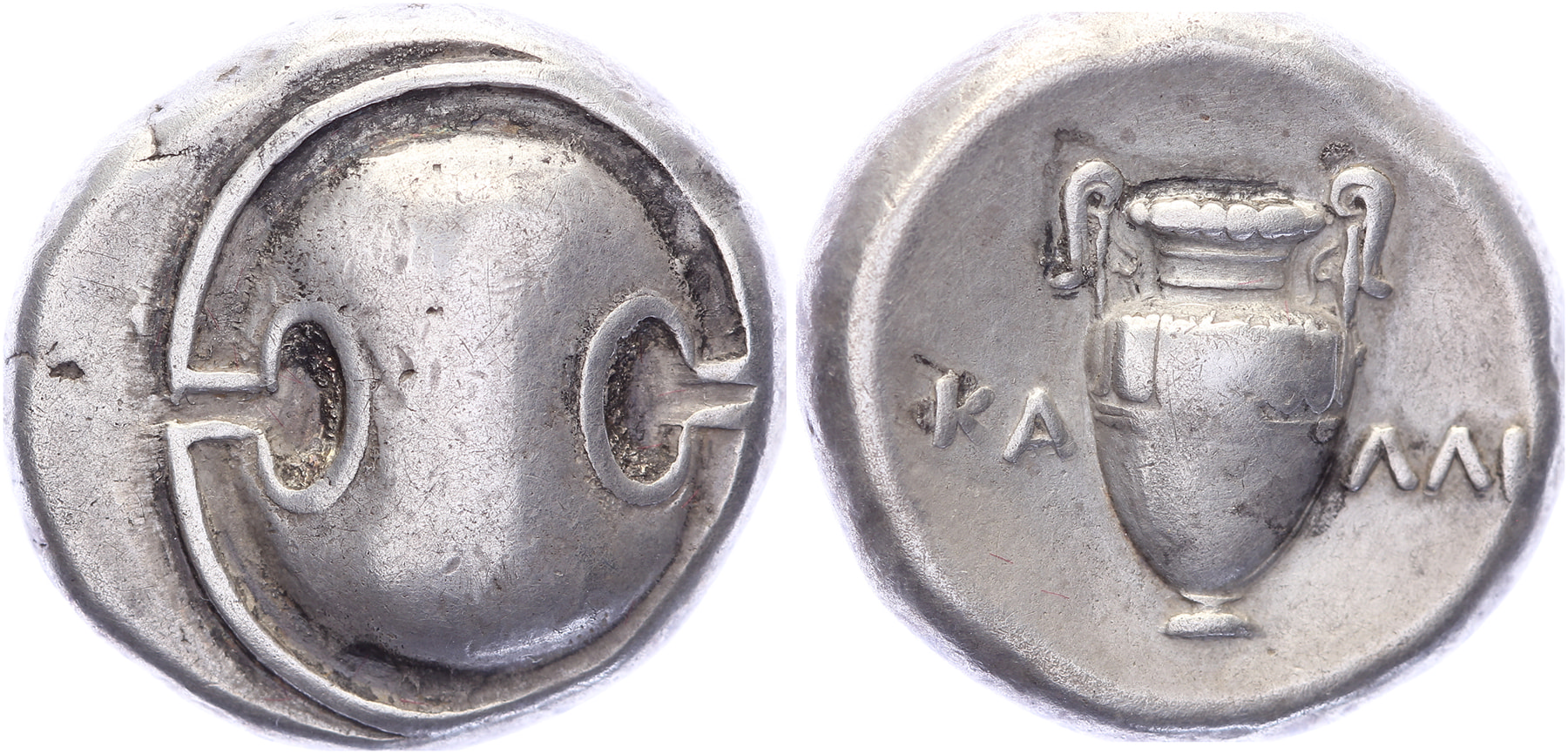Circa 395-338 BC. AR Stater [12,08 gm, 20,7 mm]. Kalli[...], magistrate. Boeotian shield / KAΛΛI, Amphora. BCD Boiotia 555. Nice VF.