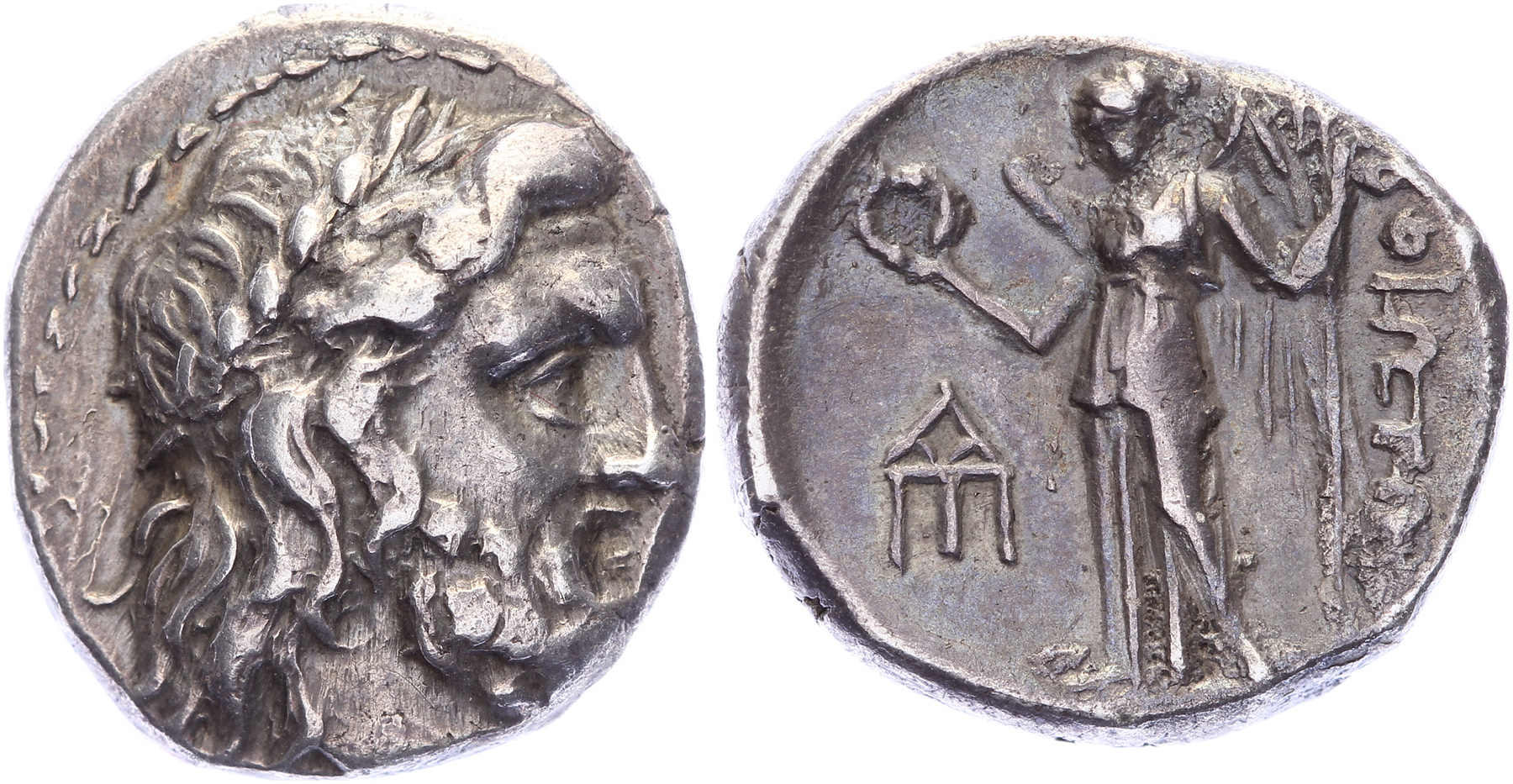 Federal Coinage. Circa 225-171 BC. AR Drachm [5,09 gm, 16,2 mm]. Laureate head of Poseidon right / BOIΩTΩ[N] on right downwards, Nike standing left holding wreath and trident; in left field monogram resembling ΠΠ topped by A. BMC 103. Minor areas of roughness on reverse, toned gVF.
