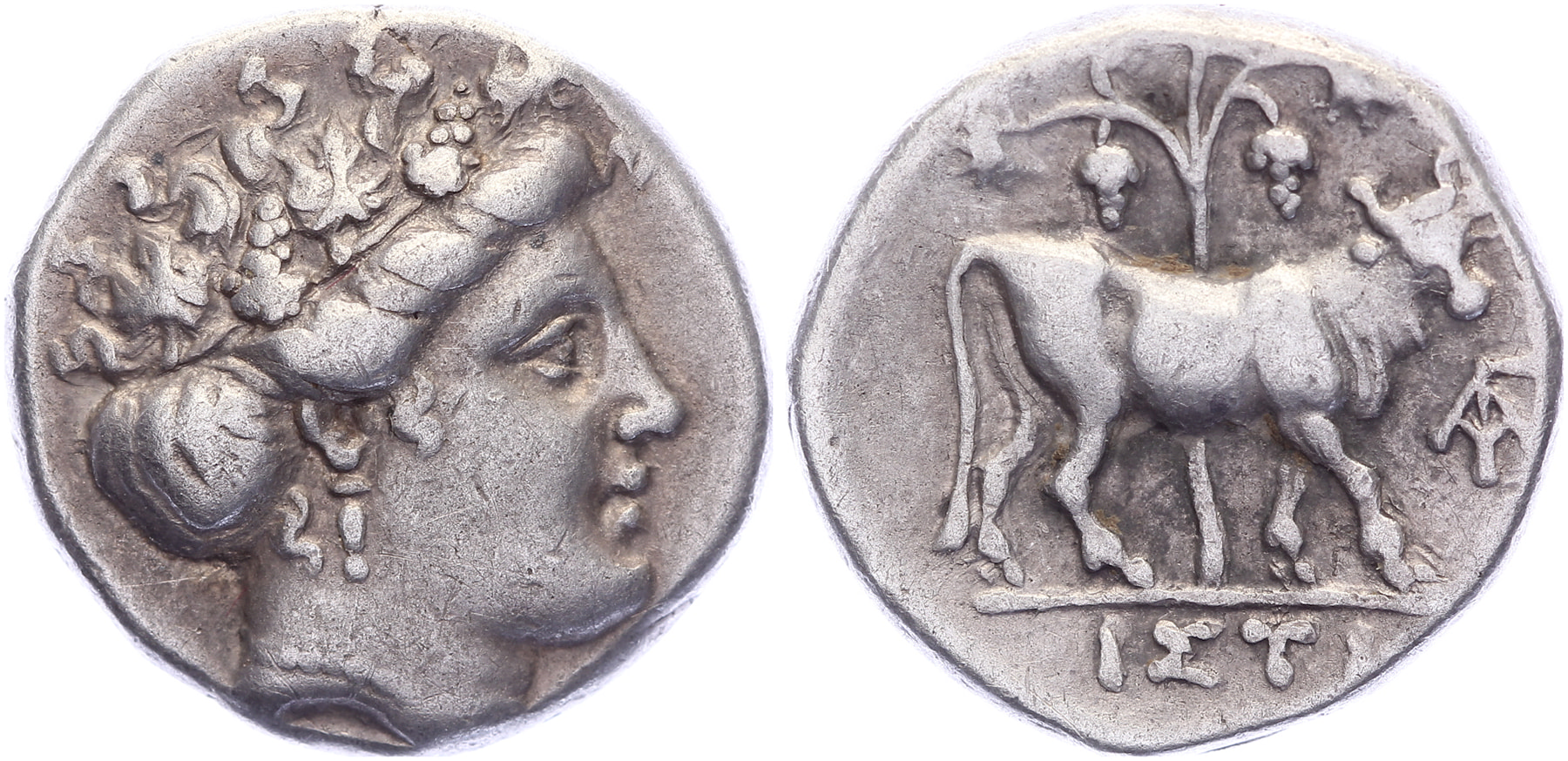 Circa 350-300 BC. AR Drachm [3,37 gm, 15,5 mm]. Head of the nymph Histiaia to right, wearing wreath of grape leaves and berries / ΙΣΤΙ Bull standing right; behind, grapevine with two grape bunches; to right, monogram. BCD Euboia 373. SNG Copenhagen 516. Lightly toned nice VF.Purchased from Münzhandlung Schöller, march 2004 (Moneta Kerkrade fair)