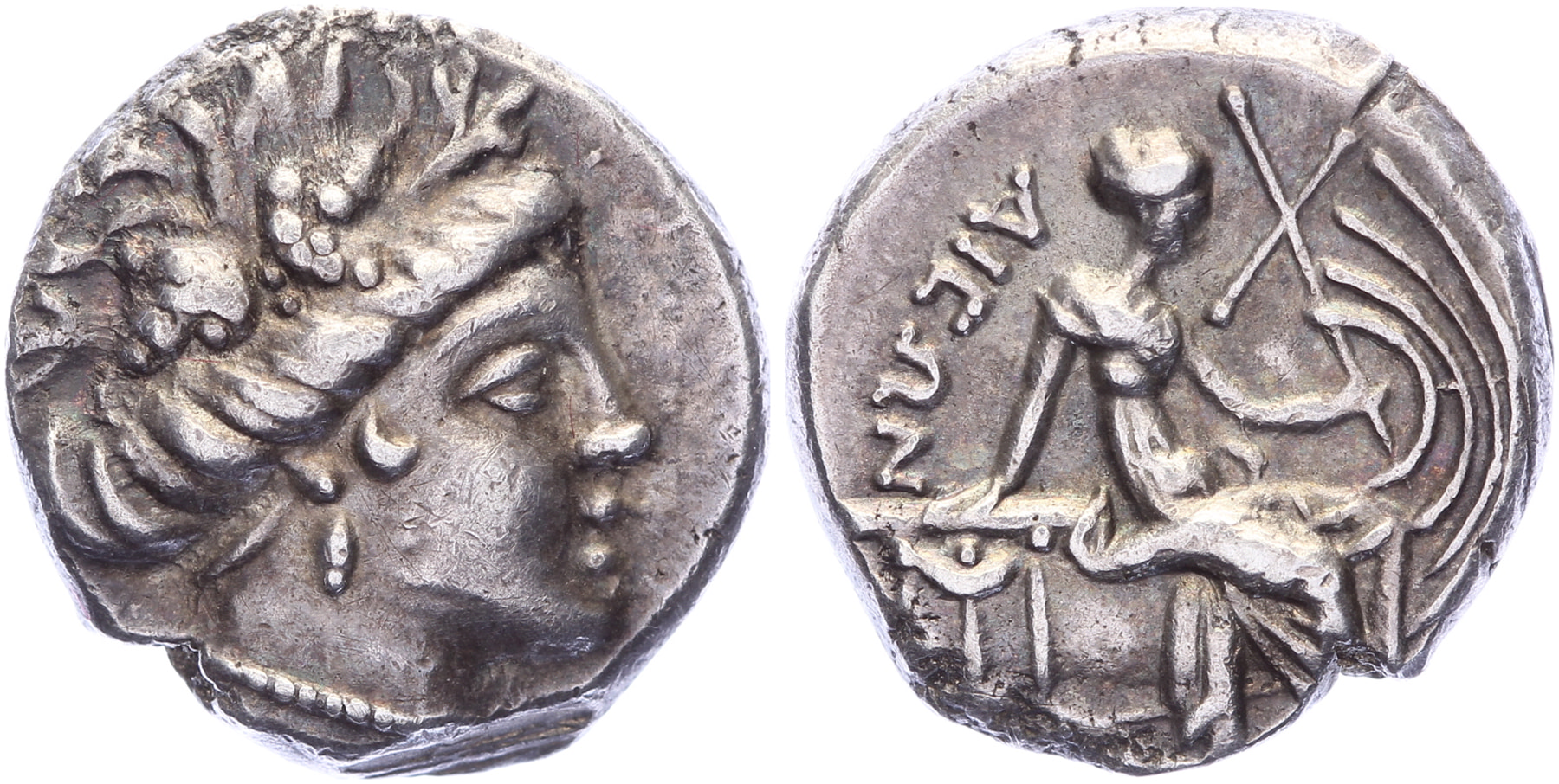 3rd-2nd centuries BC. AR Tetrobol [2,35 gm, 13,4 mm]. Head of the nymph Histiaia to right, wearing a drop earring, a pearl necklace and with her hair rolled and bound with a wreath of grape leaves and berries / [IΣTI] – AIEΩN, nymph seated right on stern of galley, holding styis in her left hand and resting her right on the deck; on the side of the stern, wing. BMC 101.  Toned gVF.Purchased from H.D. Rauch, april 1993, Auction 50, lot 124