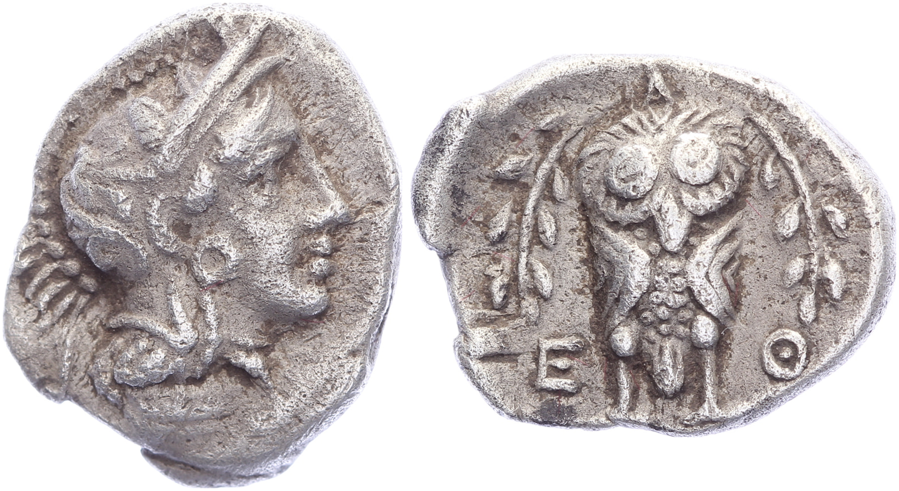 Circa 353-294 BC. AR Hemidrachm [2,06 gm, 12,4 mm]. Head of Athena to right, wrearing crested Attic helmet decorated with three olive leaves and palmette / A-Θ-E, owl standing facing between olive branches. Kroll 12; SNG Copenhagen 44-48. Minor porosity, VF.Purchased from Tom Vossen, November 2004