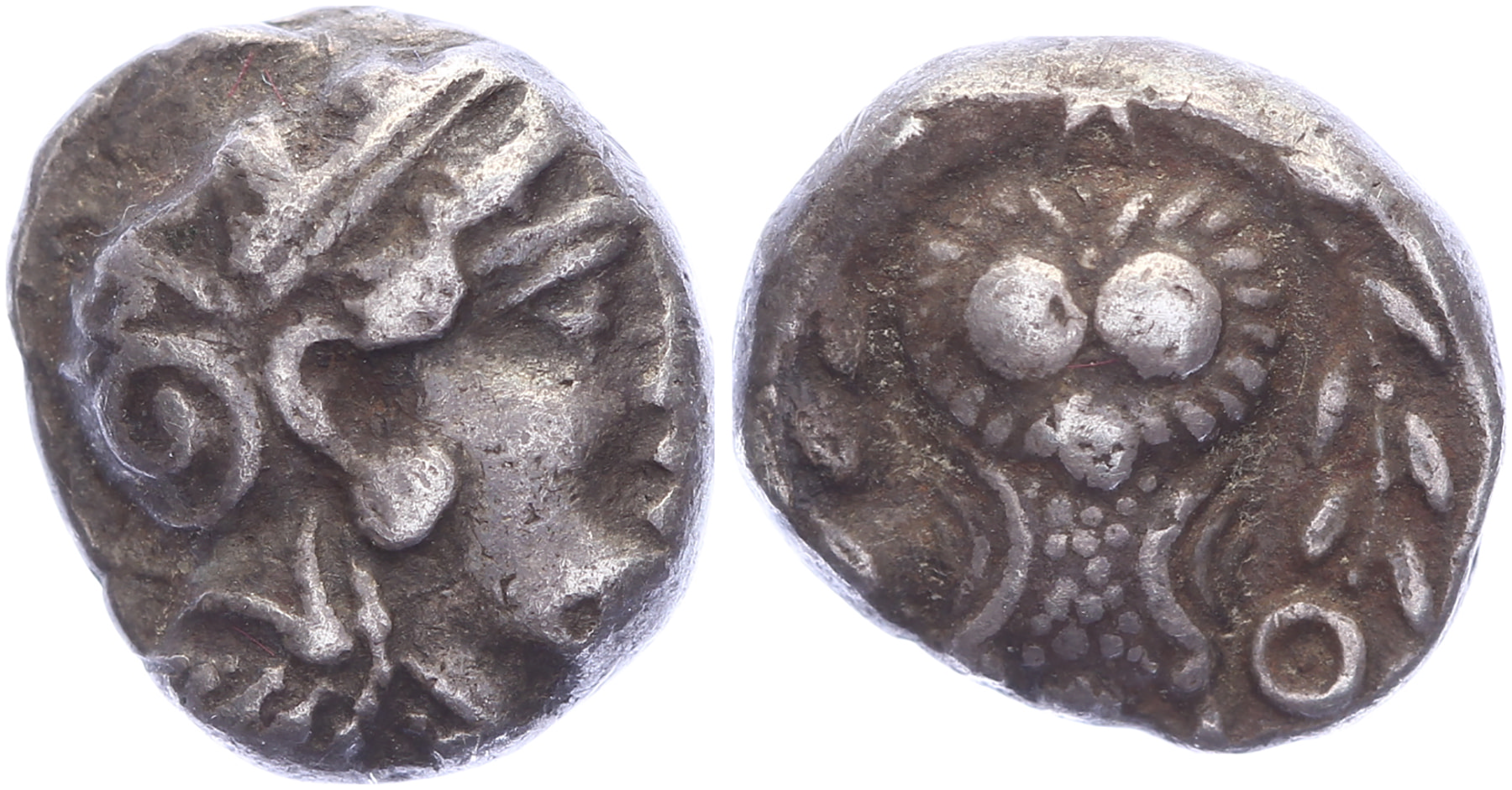 Circa 353-294 BC. AR Hemidrachm [2,11 gm, 10,6 mm]. Head of Athena to right, wrearing crested Attic helmet decorated with three olive leaves and palmette / A-Θ-[E], owl standing facing between olive branches. Kroll 12; SNG Copenhagen 44-48. Short flan, toned VF.Purchased from Tom Vossen, November 2008
