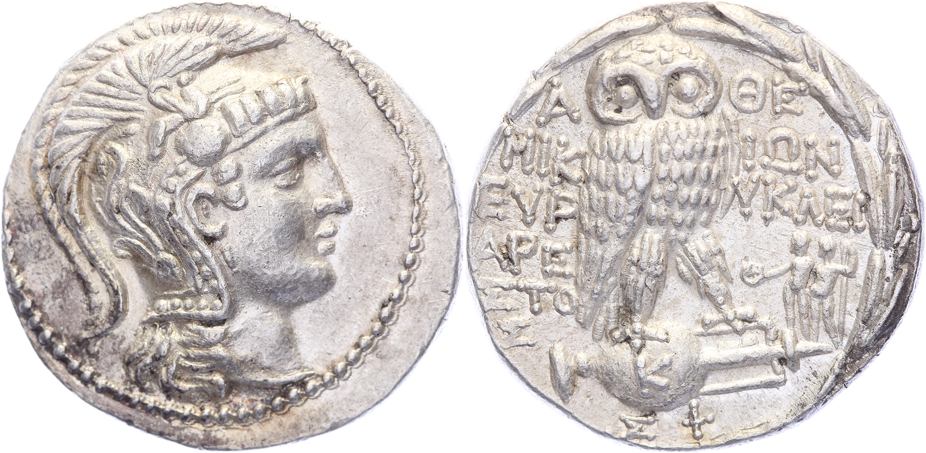 Circa 124-123 BC. AR Tetradrachme [16,84 gm, 29,8 mm]. “New Style” or “stephaniphoros” coinage, Mikion, Euryklei and Arestos magistrates. Head of Athena Parthenos to right, wearing triple-crested Attic helmet adorned with Pegasos / ΑΘΕ ΜΙΚΙΩN EYPYKΛE / APEΣTOΣ, owl standing facing on amphora; to right, Dioskouroi to left; on amphora, K; below amphora, ΣΦ (= contractor’s initials). SNG Copenhagen 265; Thompson 488d-f. gVF.Purchased from H.D. Rauch, February 1996, Auction 56 lot 119