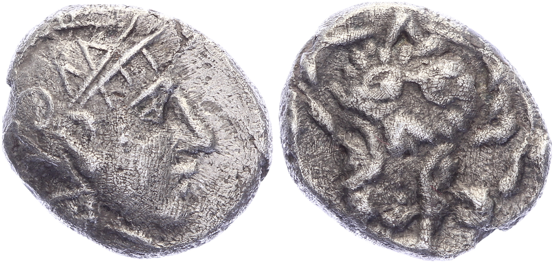 Circa 350-295 BC. AR Hemidrachm [1,94 gm, 12 mm]. Head of Athena in crested Attic helmet right / A-Θ-[E] anti-clockwise from top, owl standing facing, with tufted head and large eyes, wings closed, beneath two laurel branches. Kroll Agora 19; Svoronos pl. 21,46. Possibly an imitative issue from the Levant. Granular surfaces, VF.Purchased from Karel de Geus muntveilingen BV, November 2019, lot 1581