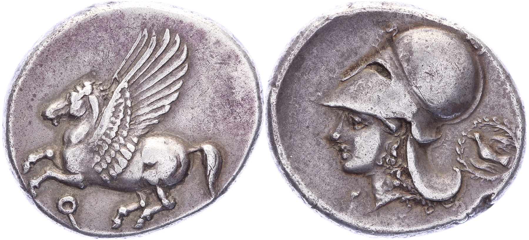 Circa 375-300 BC. AR Stater [8,50 gm, 22,9 mm]. Pegasus flying left; below, koppa / Head of Athena left, wearing Corinthian helmet decorated; in right field, dove within wreath and below chin, Γ. Ravel 1029; Calciati, Pegasi 419; BCD Korinth 110. Toned nice VF.