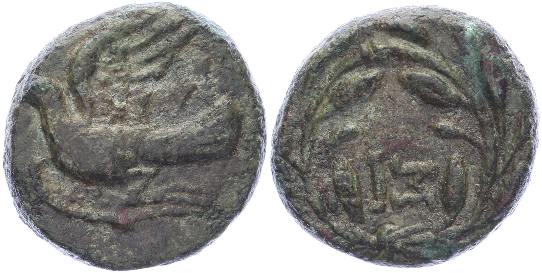 Circa 250-200 BC. Æ Chalkous [2,56 gm, 13,8 mm]. Dove flying left / ΣI within wreath with ties above. Warren, Bronze, Group 4C, 8; BCD Peloponnesos 317.15–6. VF.