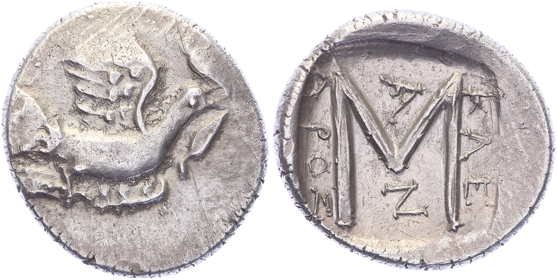 Circa 90-60 BC. AR Triobol or Hemidrachm [2,43 gm, 16,2 mm]. Kleandros, magistrate. Dove flying right, T below wing / KΛE/A-N/ΔPOΣ, ΣI, large Σ, magistrate’s name around, all within incuse square. BCD Peloponnesos 342. Lightly toned minor obverse die rust, gVF.Purchased from Holleman, December 2003
