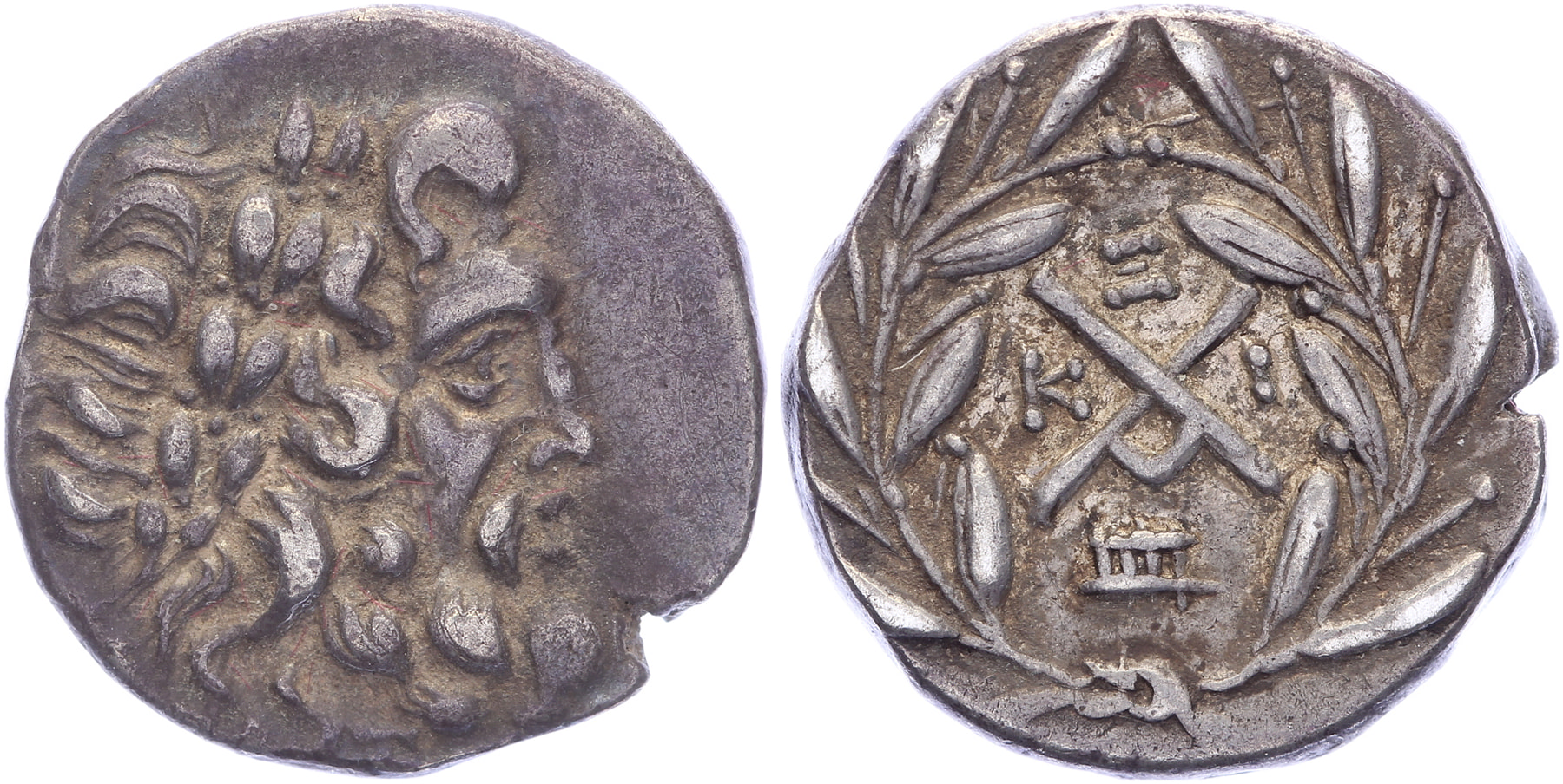 AR Hemidrachm [2,38 gm, 15,5 mm]. Laureate head of Zeus right / AX monogram; K-I across; above, Σ; below, syrinx; all within laurel wreath. Benner 15. Toned nice VF.Purchased from Thierry de Craeker, May 2001 (Leuven coin fair)